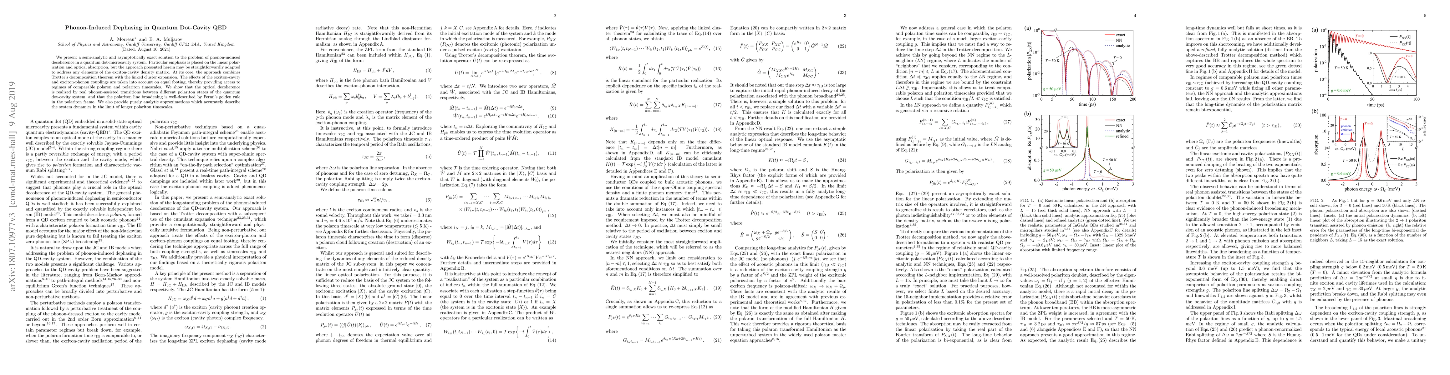 This paper presents a semi-analytic solution for phonon-induced decoherence in quantum dot-cavity systems, using Trotter's decomposition and linked cluster expansion. It reveals that optical decoherence is due to phonon-assisted transitions between polariton states, with line broadening described by Fermi's golden rule.
