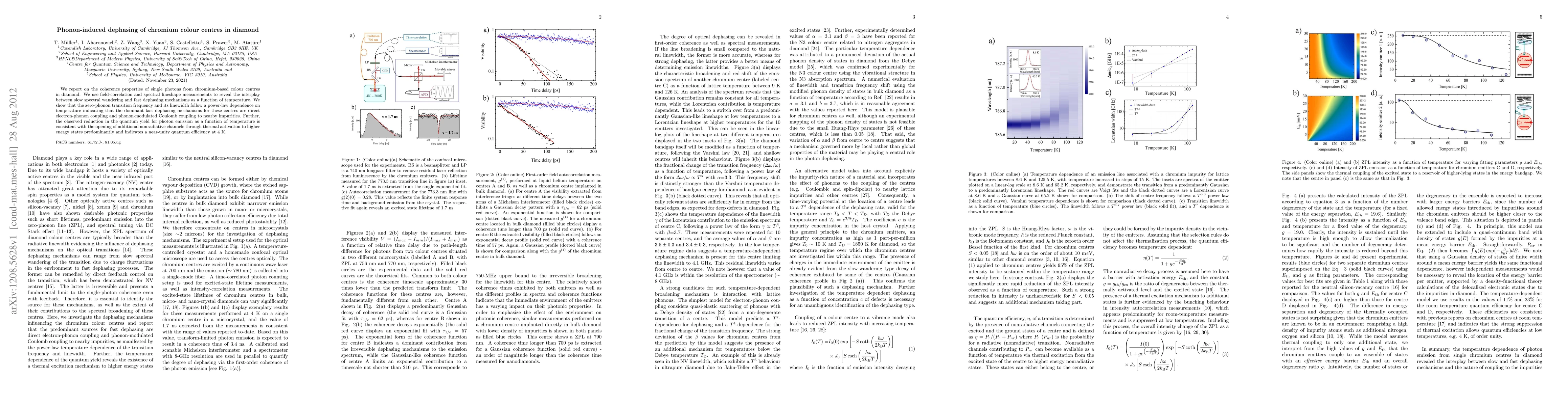 This research investigates the coherence properties of single photons from chromium colour centres in diamond, revealing that phonon-induced dephasing is dominated by electron-phonon and phonon-modulated Coulomb coupling. The study shows a temperature-dependent zero-phonon transition frequency and identifies near-unity quantum efficiency at 4 K.