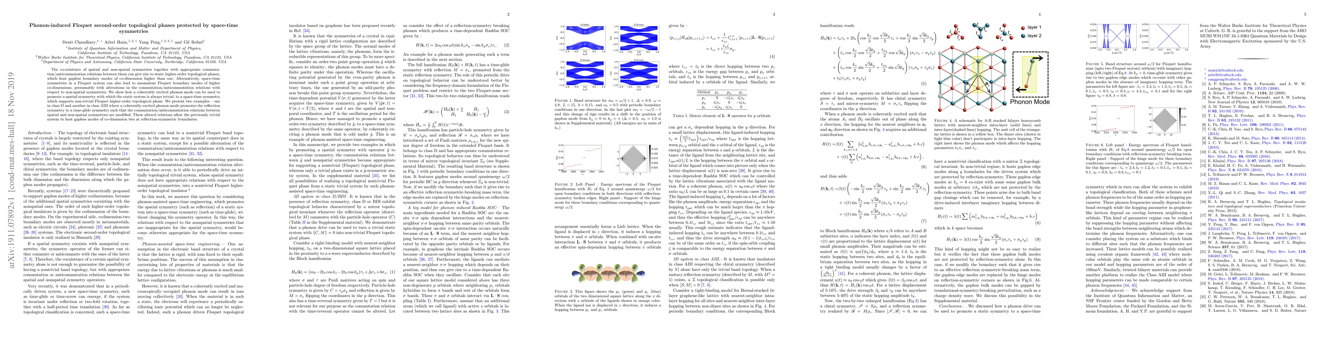 This paper explores how phonon-induced Floquet systems can create higher-order topological phases protected by space-time symmetries, demonstrating two examples in classes D and AIII where phonon excitations modify symmetry relations to enable gapless boundary modes of co-dimension two.