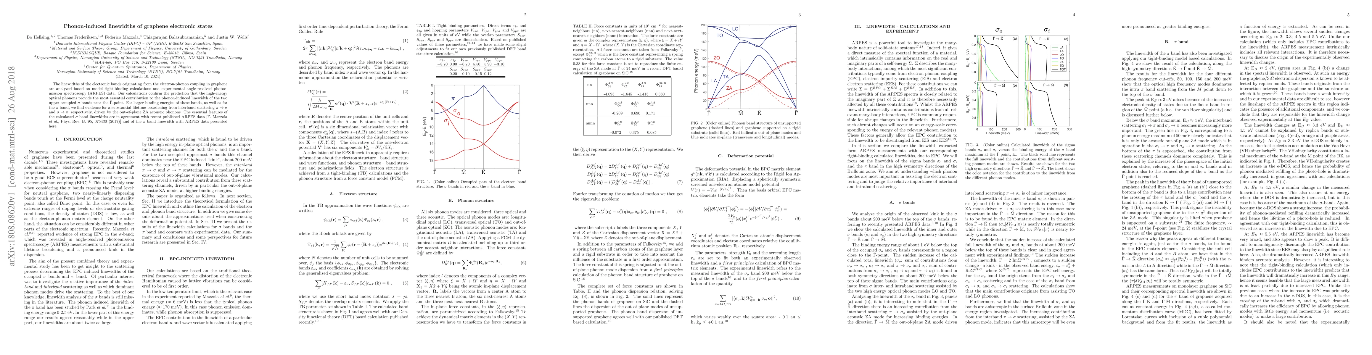 This study analyzes graphene's electronic band linewidths due to electron-phonon coupling via tight-binding calculations and ARPES data. High-energy optical phonons significantly contribute to the linewidths of the two upper occupied σ bands near the Γ-point. For larger binding energies and the π band, interband scattering driven by out-of-plane ZA acoustic phonons causes substantial lifetime broadening. Calculated σ band linewidths align with published ARPES data, and π band linewidths correspond with new ARPES data presented in this research.