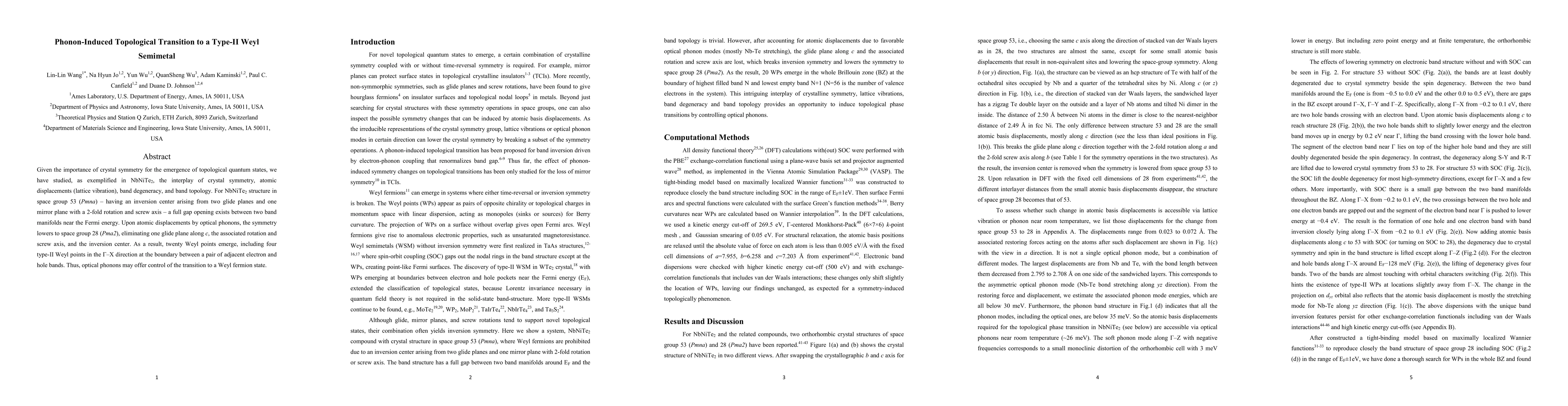 Given the importance of crystal symmetry for the emergence of topological quantum states, we have studied, as exemplified in NbNiTe2, the interplay of crystal symmetry, atomic displacements (lattice vibration), band degeneracy, and band topology. For NbNiTe2 structure in space group 53 (Pmna) - having an inversion center arising from two glide planes and one mirror plane with a 2-fold rotation and screw axis - a full gap opening exists between two band manifolds near the Fermi energy. Upon atomic displacements by optical phonons, the symmetry lowers to space group 28 (Pma2), eliminating one glide plane along c, the associated rotation and screw axis, and the inversion center. As a result, twenty Weyl points emerge, including four type-II Weyl points in the G-X direction at the boundary between a pair of adjacent electron and hole bands. Thus, optical phonons may offer control of the transition to a Weyl fermion state.