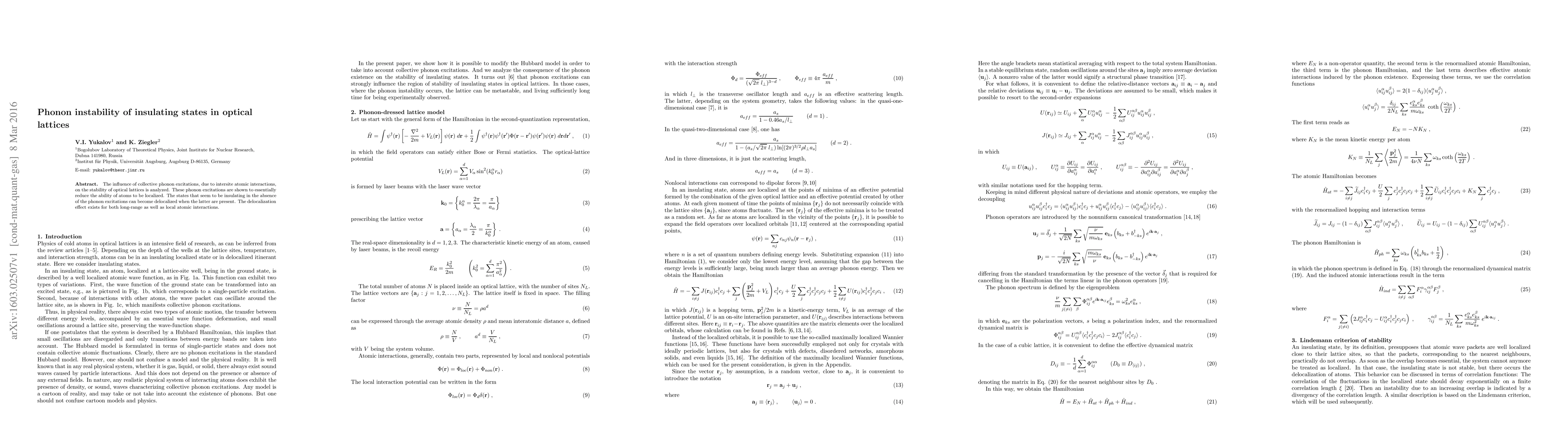 This paper investigates how collective phonon excitations in optical lattices destabilize insulating states, showing that these excitations can cause localized atoms to become delocalized, regardless of the type of atomic interactions involved.