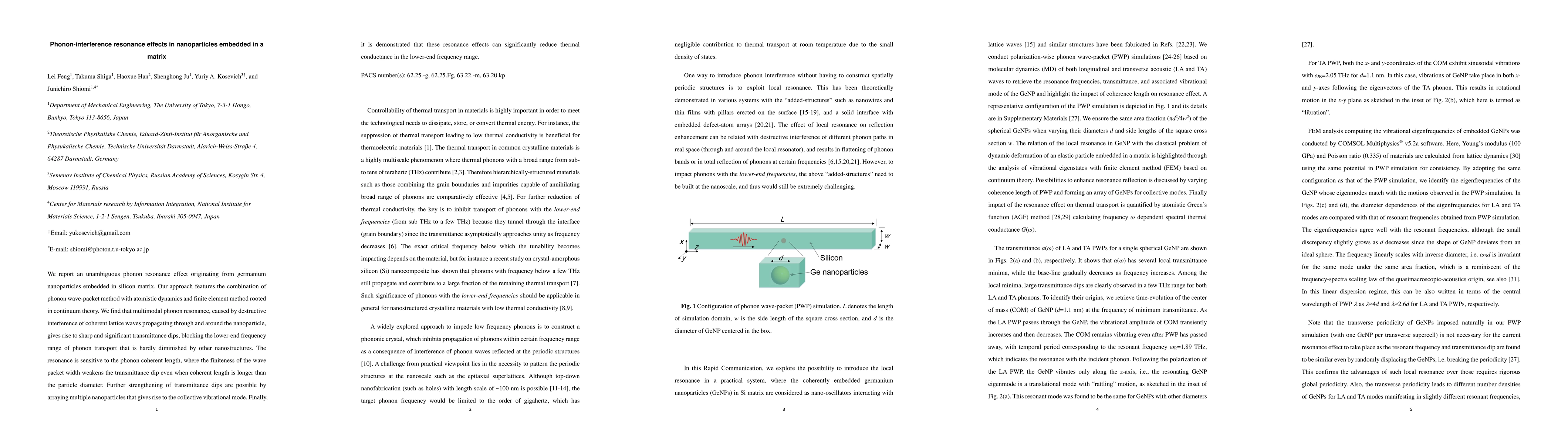 We report an unambiguous phonon resonance effect originating from germanium nanoparticles embedded in silicon matrix. Our approach features the combination of phonon wave-packet method with atomistic dynamics and finite element method rooted in continuum theory. We find that multimodal phonon resonance, caused by destructive interference of coherent lattice waves propagating through and around the nanoparticle, gives rise to sharp and significant transmittance dips, blocking the lower-end frequency range of phonon transport that is hardly diminished by other nanostructures. The resonance is sensitive to the phonon coherent length, where the finiteness of the wave packet width weakens the transmittance dip even when coherent length is longer than the particle diameter. Further strengthening of transmittance dips are possible by arraying multiple nanoparticles that gives rise to the collective vibrational mode. Finally, it is demonstrated that these resonance effects can significantly reduce thermal conductance in the lower-end frequency range.