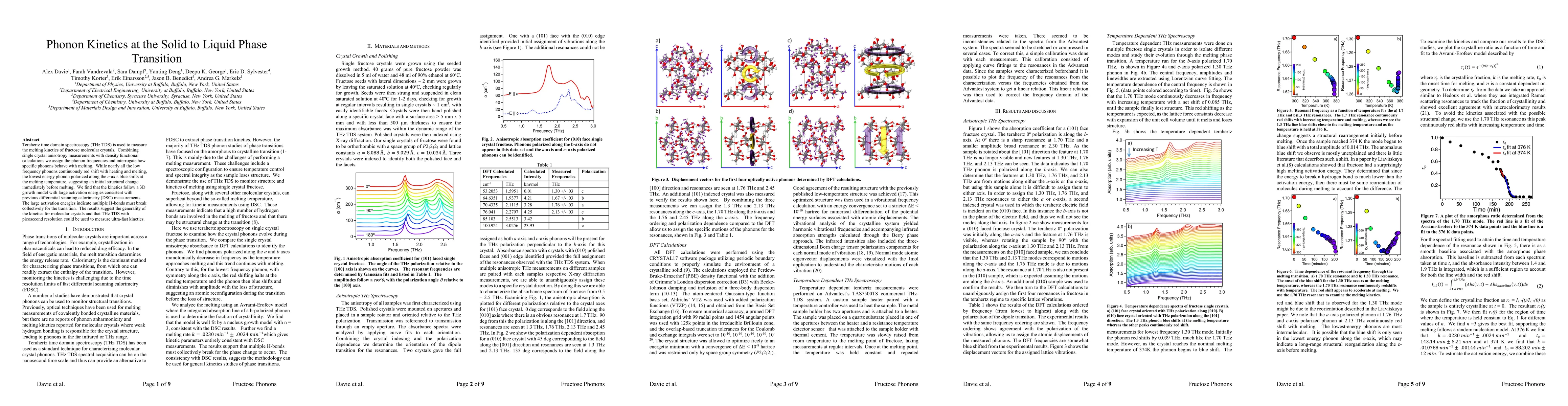 Terahertz time domain spectroscopy (THz TDS) is used to measure the melting kinetics of fructose molecular crystals. Combining single crystal anisotropy measurements with density functional calculations we assign the phonon frequencies and interrogate how specific phonons behave with melting. While nearly all the low frequency phonons continuously red shift with heating and melting, the lowest energy phonon polarized along the c-axis blue shifts at the melting temperature, suggesting an initial structural change immediately before melting. We find that the kinetics follow a 3D growth model with large activation energies consistent with previous differential scanning calorimetry (DSC) measurements. The large activation energies indicate multiple H-bonds must break collectively for the transition. The results suggest the generality of the kinetics for molecular crystals and that THz TDS with picosecond resolution could be used to measure ultra-fast kinetics.