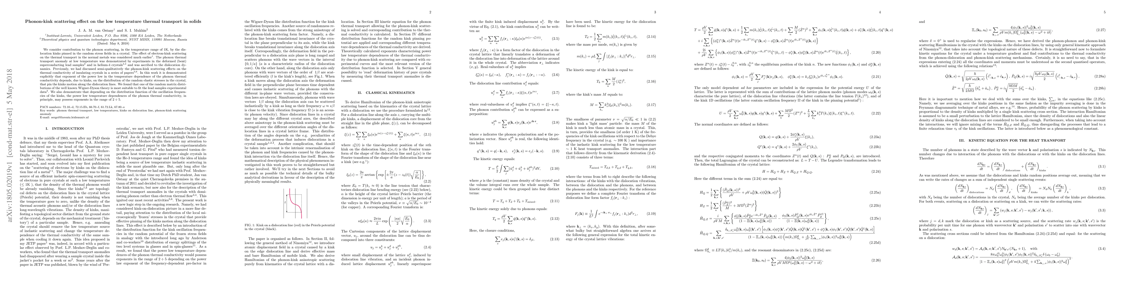 This paper investigates the phonon scattering caused by dislocation kinks in crystals at low temperatures (around 1K) and its impact on thermal transport. It demonstrates that the temperature dependence of phonon thermal conductivity is influenced by the distribution of random elastic stresses pinning the kinks, with the Wigner-Dyson random matrix distribution fitting the experimental data for lead samples. The study concludes that the phonon thermal conductivity can exhibit power law exponents ranging from 2 to 5 depending on the kink frequency distribution.