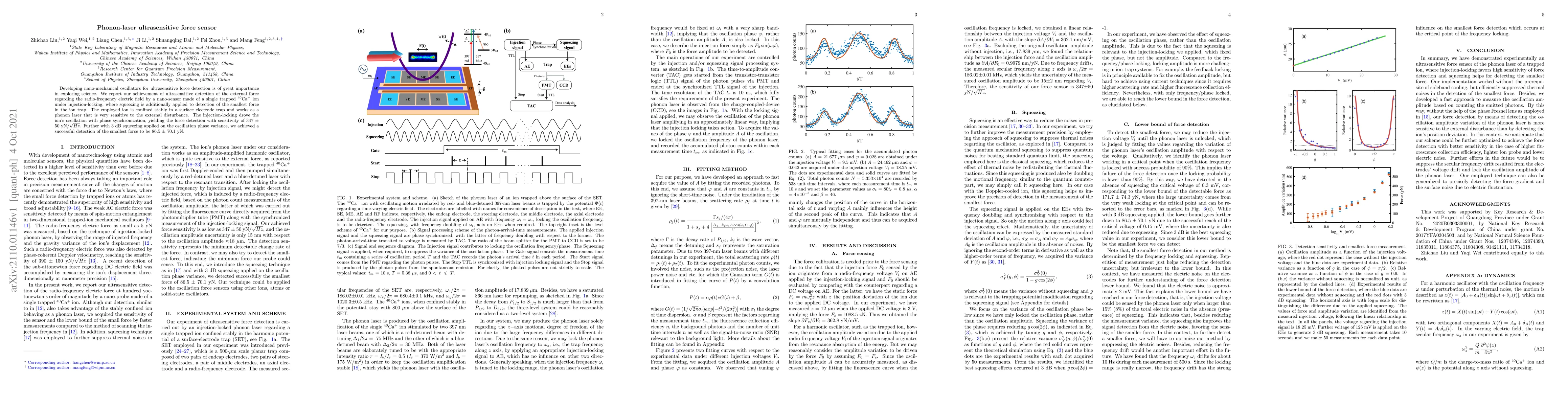 Developing nano-mechanical oscillators for ultrasensitive force detection is of great importance in exploring science. We report our achievement of ultrasensitive detection of the external force regarding the radio-frequency electric field by a nano-sensor made of a single trapped $^{40}$Ca$^{+}$ ion under injection-locking, where squeezing is additionally applied to detection of the smallest force in the ion trap. The employed ion is confined stably in a surface electrode trap and works as a phonon laser that is very sensitive to the external disturbance. The injection-locking drove the ion's oscillation with phase synchronization, yielding the force detection with sensitivity of 347 $\pm$ 50 yN/$\sqrt{Hz}$. Further with 3 dB squeezing applied on the oscillation phase variance, we achieved a successful detection of the smallest force to be 86.5 $\pm$ 70.1 yN.