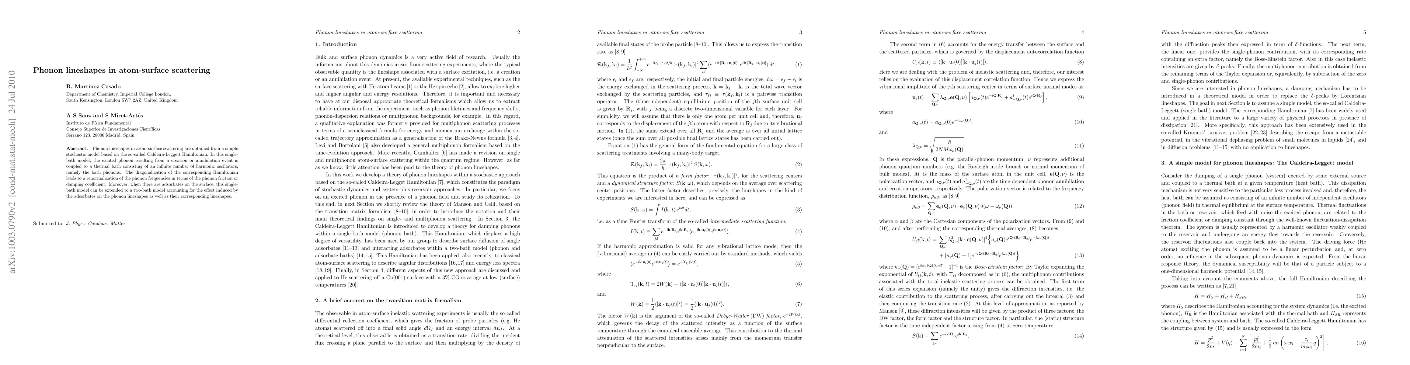 Phonon lineshapes in atom-surface scattering are obtained from a simple stochastic model based on the so-called Caldeira-Leggett Hamiltonian. In this single-bath model, the excited phonon resulting from a creation or annihilation event is coupled to a thermal bath consisting of an infinite number of harmonic oscillators, namely the bath phonons. The diagonalization of the corresponding Hamiltonian leads to a renormalization of the phonon frequencies in terms of the phonon friction or damping coefficient. Moreover, when there are adsorbates on the surface, this single-bath model can be extended to a two-bath model accounting for the effect induced by the adsorbates on the phonon lineshapes as well as their corresponding lineshapes.