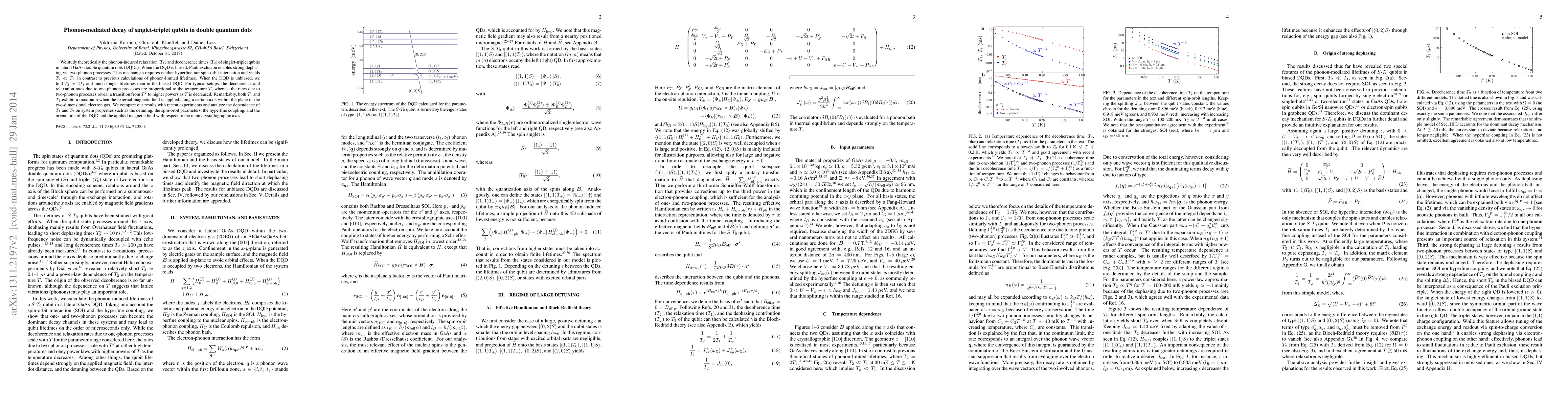 This paper theoretically investigates phonon-induced relaxation and decoherence in singlet-triplet qubits within GaAs double quantum dots, revealing strong dephasing via two-phonon processes that yield $T_2 \ll T_1$. The study shows that $T_2$ is longer when the dots are unbiased, and both $T_1$ and $T_2$ exhibit maxima under specific magnetic field orientations.