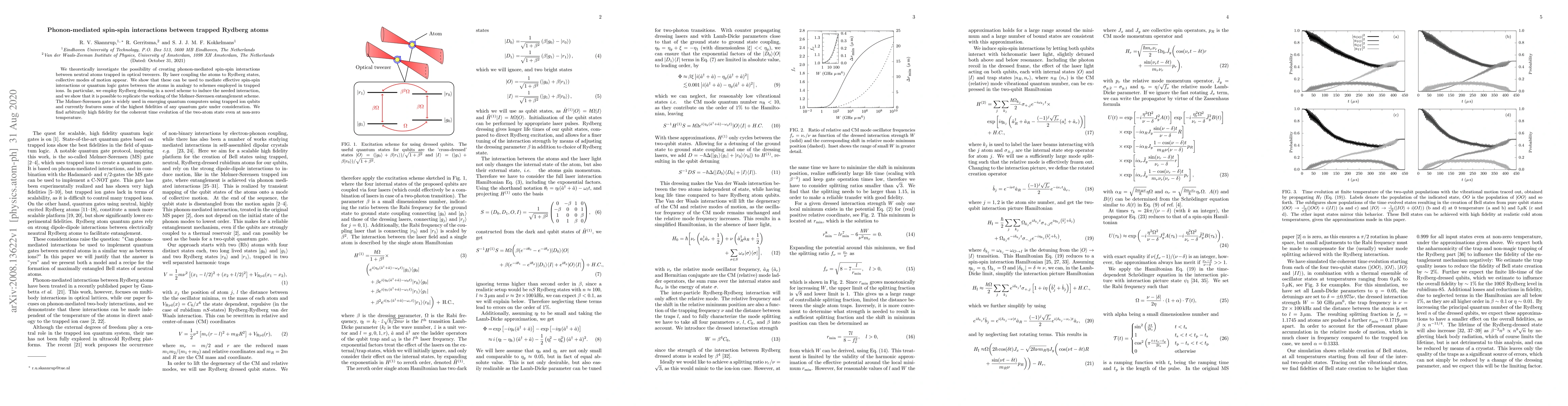 This paper explores phonon-mediated spin-spin interactions in trapped Rydberg atoms using laser coupling to Rydberg states, demonstrating a novel scheme for quantum logic gates analogous to those in trapped ions, and achieving high fidelity for the M{\o}lmer-S{\o}rensen entanglement scheme even at non-zero temperatures.
