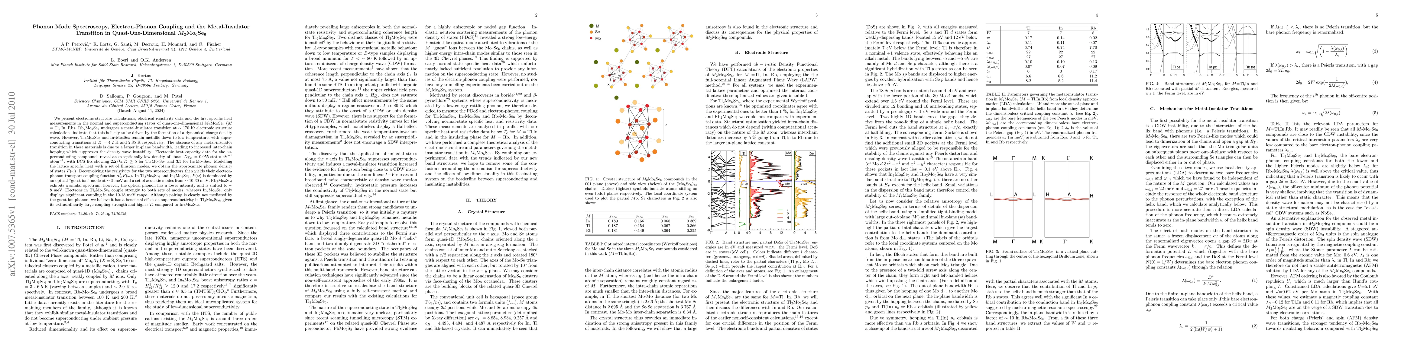 This paper investigates the metal-insulator transition and electron-phonon coupling in quasi-one-dimensional M2Mo6Se6 compounds (M = Tl, In, Rb). Rb2Mo6Se6 transitions to an insulator due to a charge density wave, while Tl2Mo6Se6 and In2Mo6Se6 remain metallic and superconducting, with differing electron-phonon coupling strengths influencing their superconducting properties.