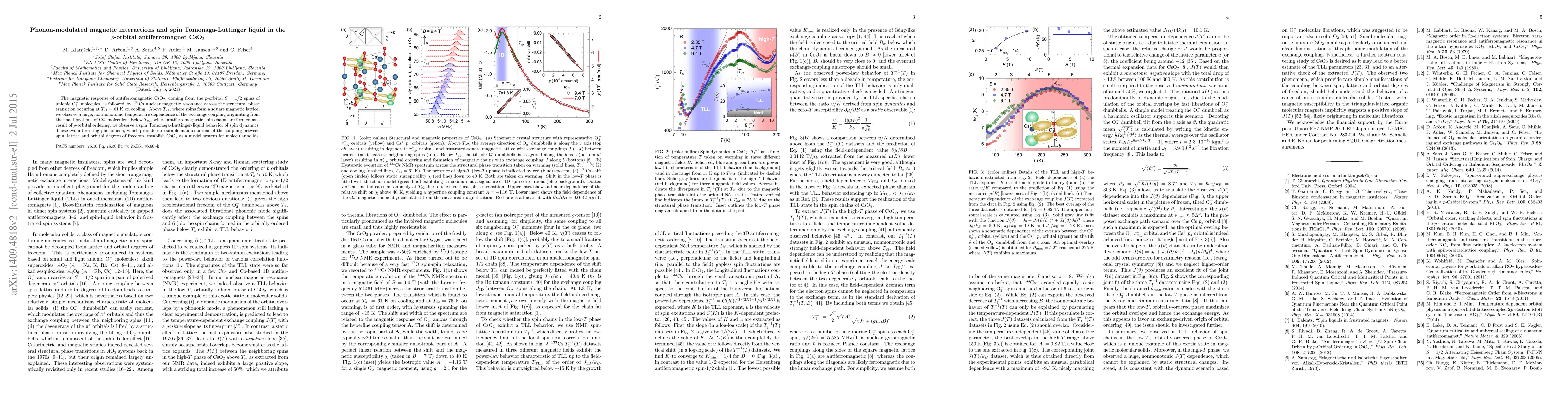 The magnetic response of antiferromagnetic CsO2, coming from the p-orbital S=1/2 spins of anionic O2- molecules, is followed by 133Cs nuclear magnetic resonance across the structural phase transition occuring at Ts1=61 K on cooling. Above Ts1, where spins form a square magnetic lattice, we observe a huge, nonmonotonic temperature dependence of the exchange coupling originating from thermal librations of O2- molecules. Below Ts1, where antiferromagnetic spin chains are formed as a result of p-orbital ordering, we observe a spin Tomonaga-Luttinger-liquid behavior of spin dynamics. These two interesting phenomena, which provide rare simple manifestations of the coupling between spin, lattice and orbital degrees of freedom, establish CsO2 as a model system for molecular solids.