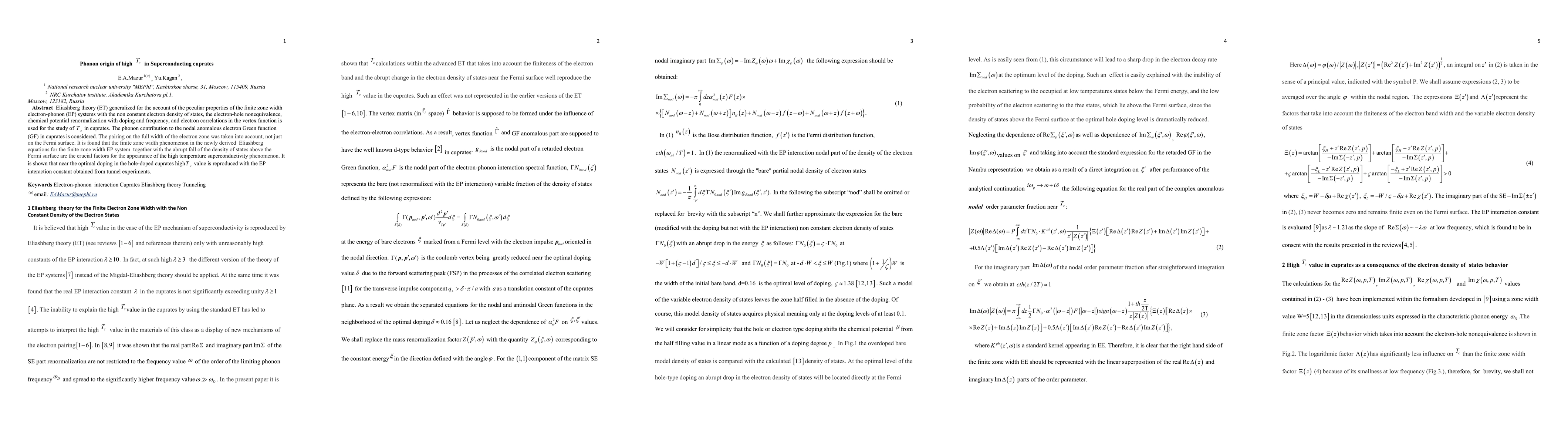 This research uses a generalized Eliashberg theory to explore the high Tc superconductivity in cuprates, emphasizing the phonon's role. It finds that the finite zone width and the fall in density of states above the Fermi level are key to high-temperature superconductivity, and confirms the EP interaction's relevance through tunnel experiments.