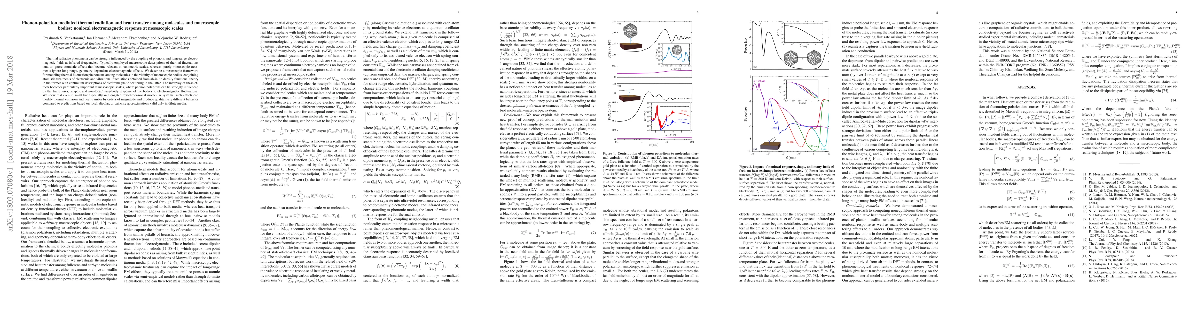Thermal radiative phenomena can be strongly influenced by the coupling of phonons and long-range electromagnetic fields at infrared frequencies. Typically employed macroscopic descriptions of thermal fluctuations tend to ignore atomistic effects that become relevant at nanometric scales, whereas purely microscopic treatments ignore long-range, geometry-dependent electromagnetic effects. We describe a mesoscopic framework for modeling thermal fluctuation phenomena among molecules in the vicinity of macroscopic bodies, conjoining atomistic treatments of electronic and vibrational fluctuations obtained from ab-initio density functional theory in the former with continuum descriptions of electromagnetic scattering in the latter. The interplay of these effects becomes particularly important at mesoscopic scales, where phonon polaritons can be strongly influenced by the finite sizes, shapes, and non-local/many-body response of the bodies to electromagnetic fluctuations. We show that even in small but especially in elongated low-dimensional molecular systems, such effects can modify thermal emission and heat transfer by orders of magnitude and produce qualitatively different behavior compared to predictions based on local, dipolar, or pairwise approximations valid only in dilute media.