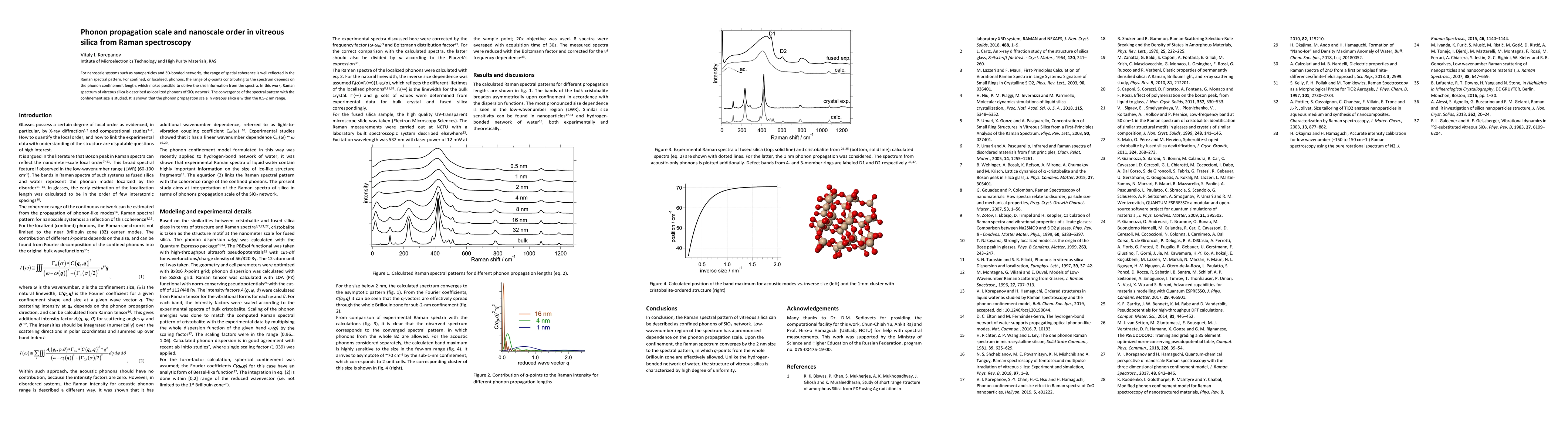 For nanoscale systems such as nanoparticles and 3D-bonded networks, the range of spatial coherence is well reflected in the Raman spectral pattern. For confined, or localized, phonons, the range of q-points contributing to the spectrum depends on the phonon confinement length, which makes possible to derive the size information from the spectra. In this work, Raman spectrum of vitreous silica is described as localized phonons of SiO2 network. The convergence of the spectral pattern with the confinement size is studied. It is shown that the phonon propagation scale in vitreous silica is within the 0.5-2 nm range.