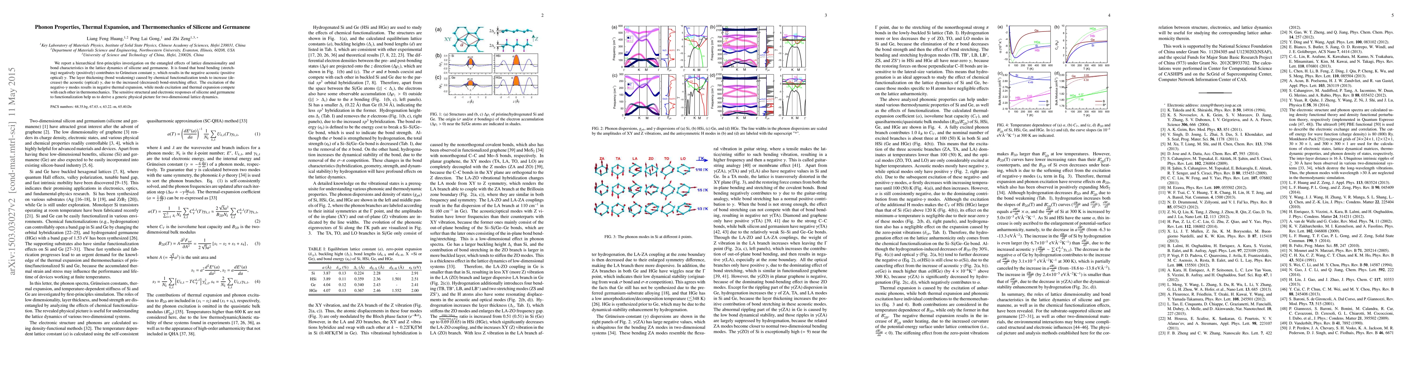 We report a hierarchical first-principles investigation on the entangled effects of lattice dimensionality and bond characteristics in the lattice dynamics of silicene and germanene. It is found that bond bending (stretching) negatively (positively) contributes to Gr\"uneisen constant, which results in the negative acoustic (positive optical) Gr\"uneisen constant. The layer thickening (bond weakening) caused by chemical functionalization tends to increase (decrease) the acoustic (optical) Gr\"uneisen constant, due to the increased (decreased) bond-stretching effect. The excitation of the negative-$\gamma$ modes results in negative thermal expansion, while mode excitation and thermal expansion compete with each other in thermomechanics. The sensitive structural and electronic responses of silicene and germanene to functionalization help us to derive a generic physical picture for two-dimensional lattice dynamics.