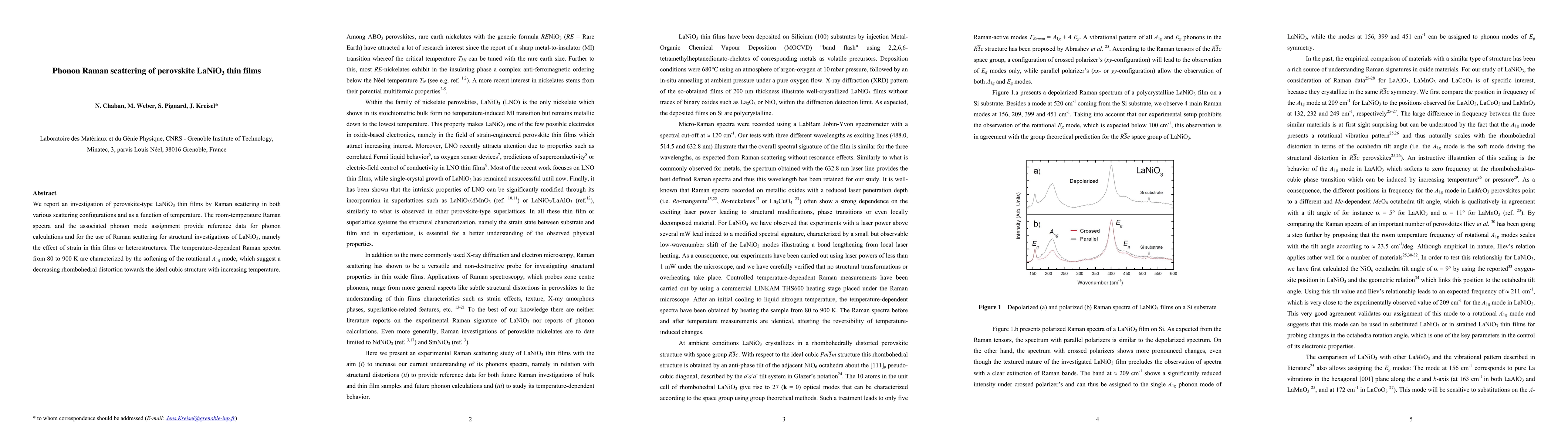 This study investigates perovskite LaNiO3 thin films using Raman scattering, providing phonon mode assignments and structural insights. Temperature-dependent spectra reveal a softening of the A1g mode, indicating reduced rhombohedral distortion with rising temperature.