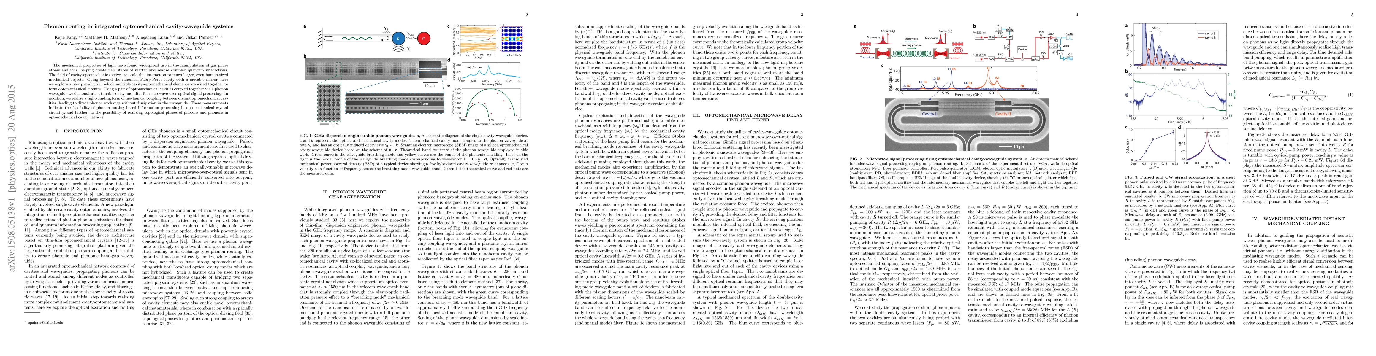 This paper demonstrates phonon routing in integrated optomechanical cavity-waveguide systems, showing a tunable delay and filter for microwave-over-optical signal processing and tight-binding mechanical coupling for phonon exchange without dissipation, indicating potential for phonon-based information processing and topological phases in optomechanical circuits.