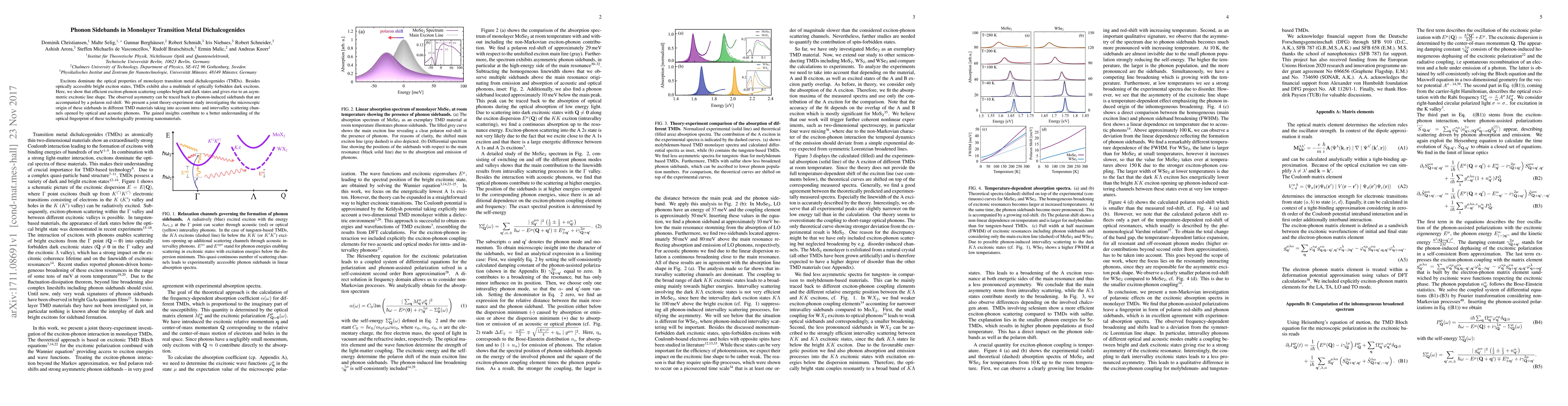 This study reveals that exciton-phonon interactions in transition metal dichalcogenides (TMDs) lead to asymmetric excitonic line shapes due to phonon-induced sidebands, accompanied by polaron redshift. The research combines theoretical and experimental analysis to elucidate the microscopic origins of these sidebands, contributing to a deeper understanding of TMDs' optical properties.