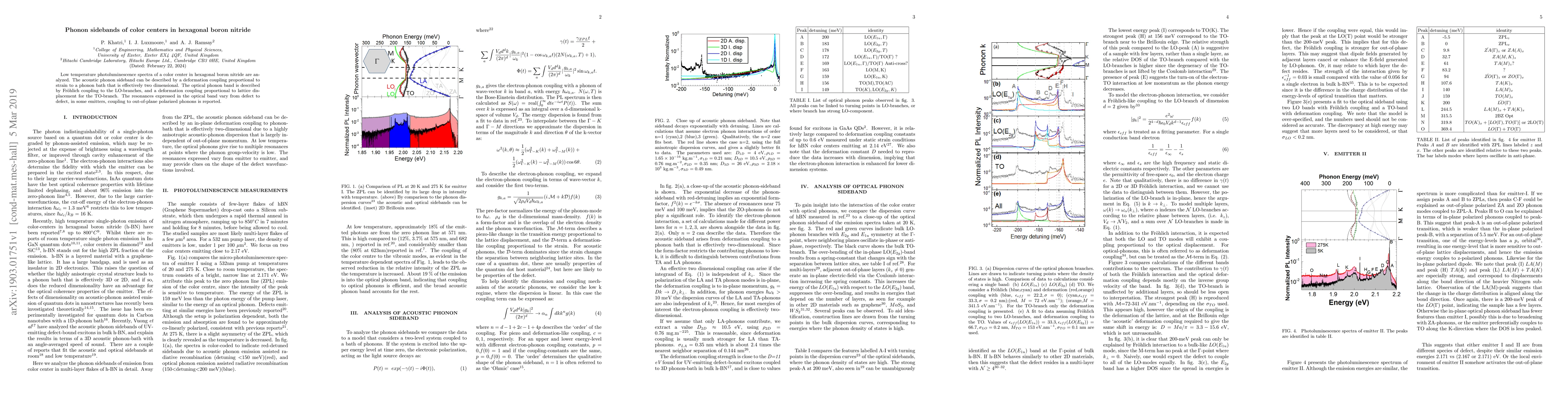 This study analyzes low-temperature photoluminescence spectra of color centers in hexagonal boron nitride, revealing acoustic phonon sidebands linked to deformation coupling and strain, and optical phonon bands characterized by Fröhlich coupling and lattice displacement effects. Variations in defect coupling to out-of-plane phonons are also noted.