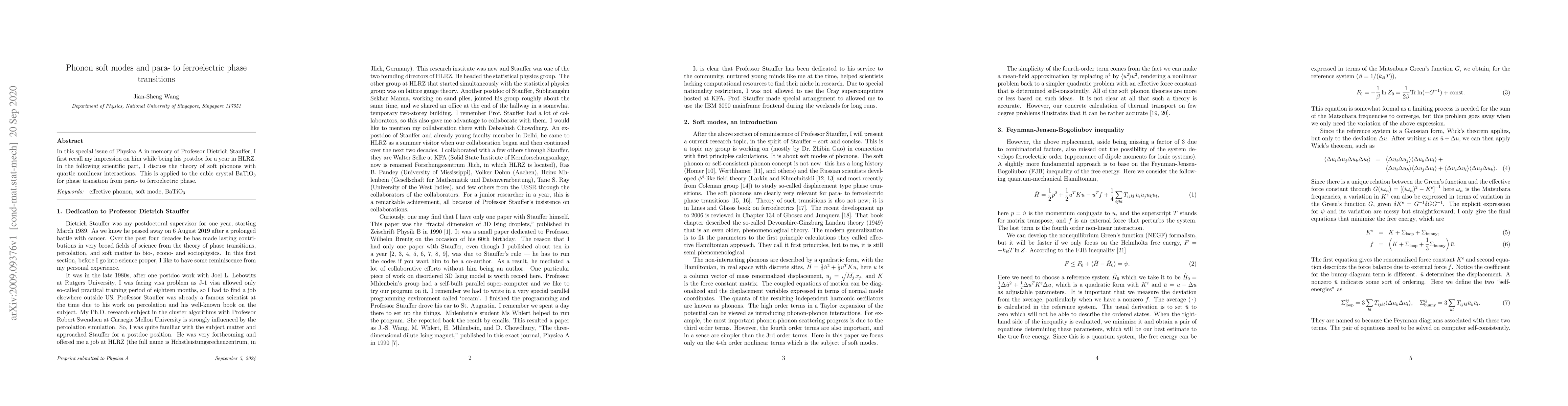 The paper discusses the theory of soft phonons with quartic nonlinear interactions, specifically applied to the cubic crystal BaTiO3, explaining the phase transition from para- to ferroelectric phase. It pays tribute to Professor Dietrich Stauffer in a special issue of Physica A.