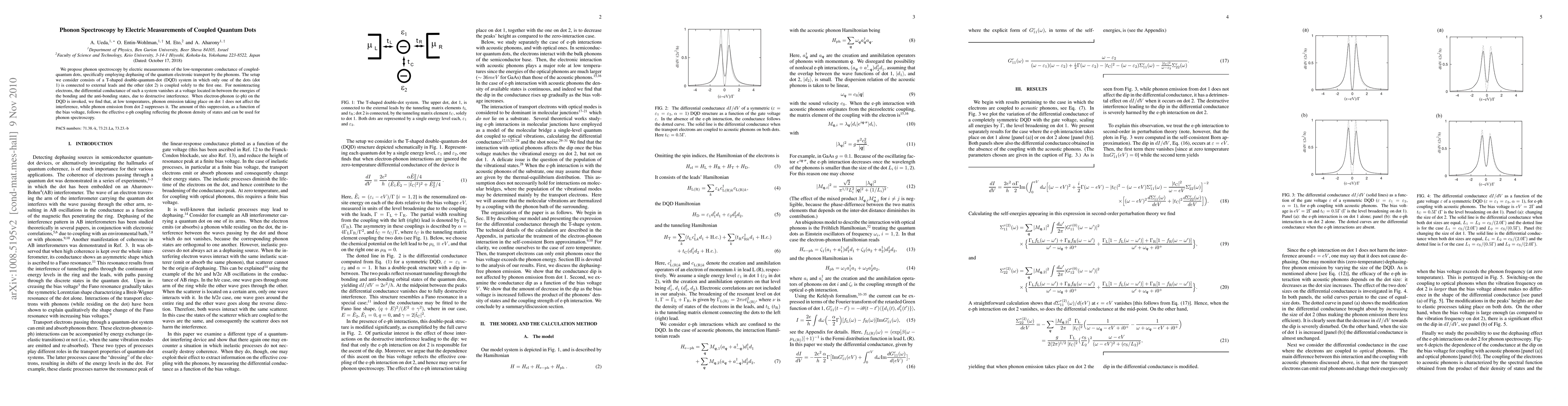 This paper proposes a method for phonon spectroscopy using electric measurements of the low-temperature conductance in coupled quantum dots, specifically observing the dephasing of quantum electronic transport by phonons. The study finds that phonon emission from dot 2 in a T-shaped double-quantum-dot system suppresses interference, allowing for phonon density of states analysis and spectroscopy.