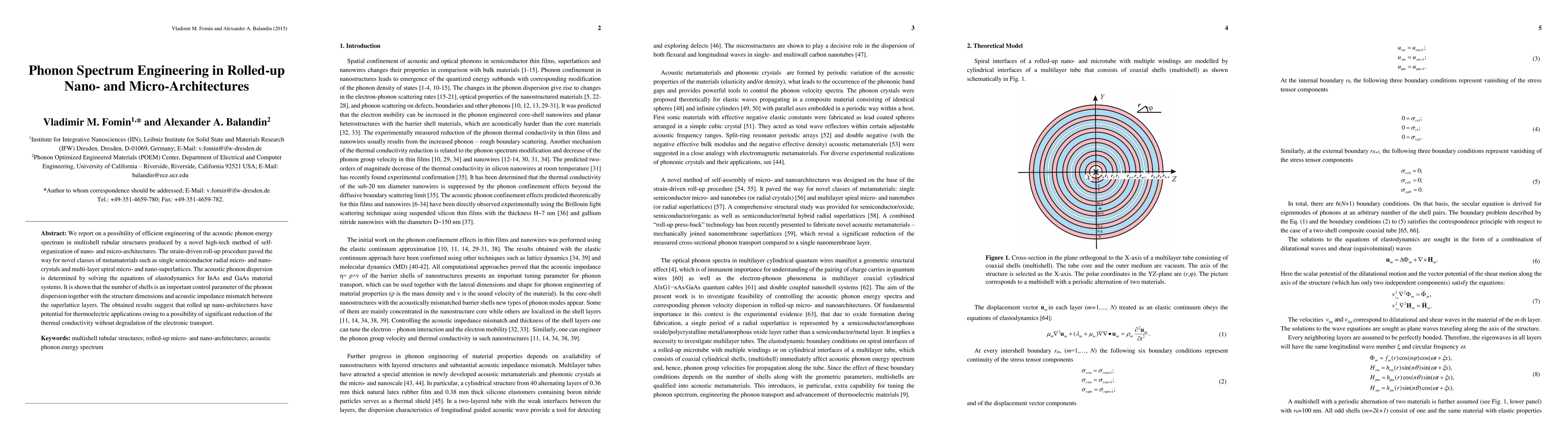 This paper explores the engineering of acoustic phonon spectra in rolled-up nano- and micro-architectures, demonstrating that the number of shells and structural dimensions significantly influence phonon dispersion. The findings suggest potential thermoelectric applications due to reduced thermal conductivity without affecting electronic transport.
