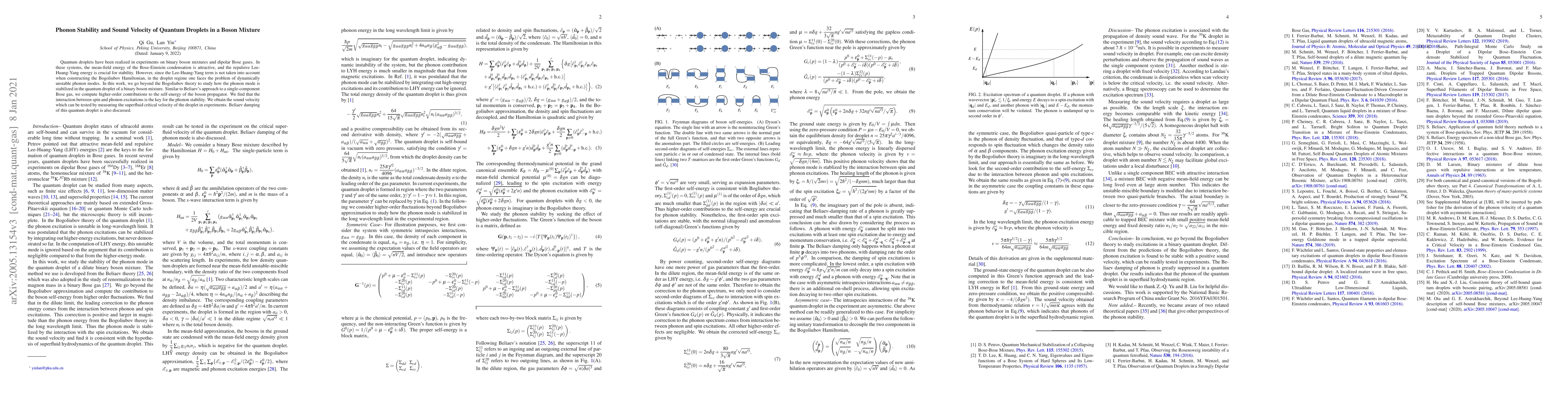 Quantum droplets have been realized in experiments on binary boson mixtures and dipolar Bose gases. In these systems, the mean-field energy of the Bose-Einstein condensation is attractive, and the repulsive Lee-Huang-Yang energy is crucial for stability. The Bogoliubov theory incorrectly predicts that the phonon mode is dynamically unstable in the long-wavelength limit. In this work, we go beyond the Bogoliubov theory to study how the phonon mode is stabilized in the quantum droplet of a binary boson mixture. Similar to Beliaev's approach to a single-component Bose gas, we compute higher-order contributions to the self-energy of the boson propagator. We find that the interaction between spin and phonon excitations is the key for the phonon stability. We obtain the sound velocity which can be tested by measuring the superfluid critical velocity of the droplet in experiments. Beliaev damping of this quantum droplet is also discussed.
