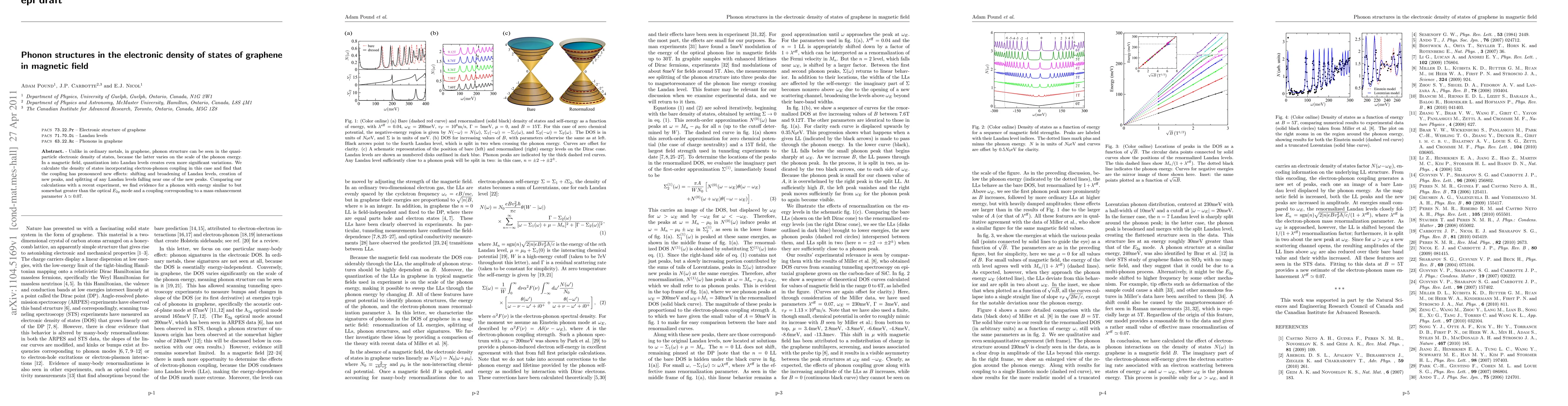 This paper investigates the phonon structures in graphene's electronic density of states under a magnetic field, revealing pronounced effects from electron-phonon coupling, including shifting and broadening of Landau levels, new peak creation, and splitting of Landau levels near new peaks. Experimental comparisons suggest a phonon with energy greater than the optical $E_{2g}$ mode and a mass enhancement parameter $\lambda \simeq 0.07$.