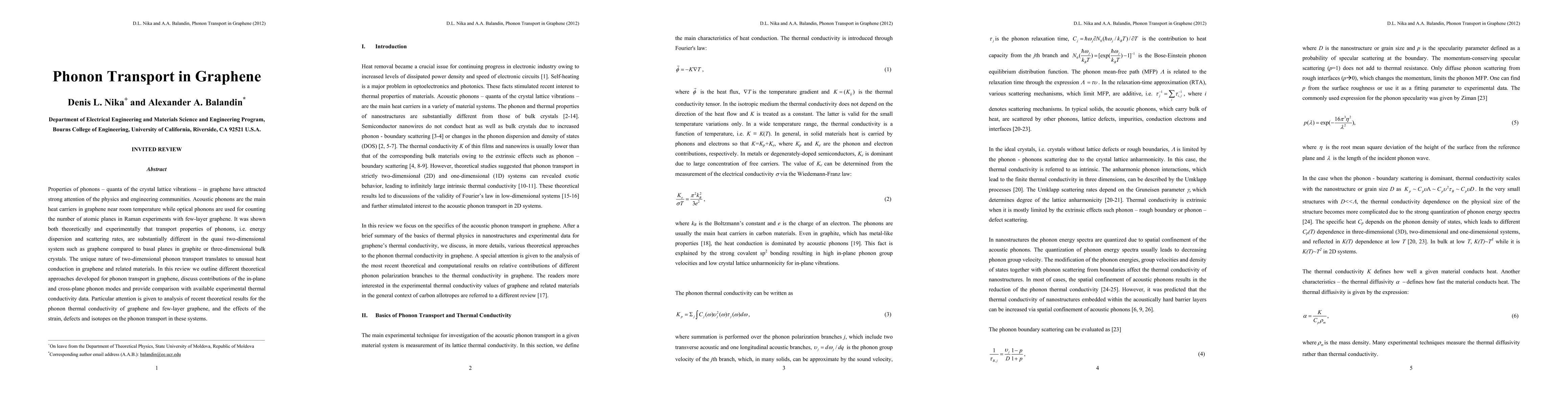 This review examines theoretical models for phonon transport in graphene, highlighting unique two-dimensional effects that influence heat conduction. It compares in-plane and cross-plane phonon modes and assesses the impact of strain, defects, and isotopes on phonon thermal conductivity, with a focus on recent findings.