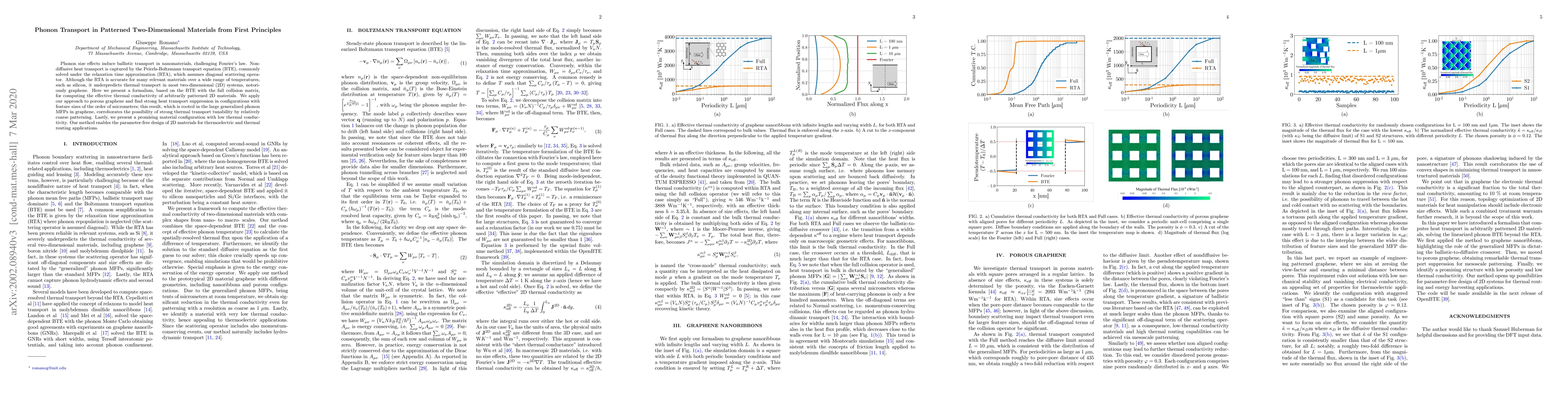 Phonon size effects induce ballistic transport in nanomaterials, challenging Fourier's law. Nondiffusive heat transport is captured by the Peierls-Boltzmann transport equation (BTE), commonly solved under the relaxation time approximation (RTA), which assumes diagonal scattering operator. Although the RTA is accurate for many relevant materials over a wide range of temperatures, such as silicon, it underpredicts thermal transport in most two-dimensional (2D) systems, notoriously graphene. Here we present a formalism, based on the BTE with the full collision matrix, for computing the effective thermal conductivity of arbitrarily patterned 2D materials. We apply our approach to porous graphene and find strong heat transport suppression in configurations with feature sizes of the order of micrometers; this result, which is rooted in the large generalized phonon MFPs in graphene, corroborates the possibility of strong thermal transport tunability by relatively coarse patterning. Lastly, we present a promising material configuration with low thermal conductivity. Our method enables the parameter-free design of 2D materials for thermoelectric and thermal routing applications.