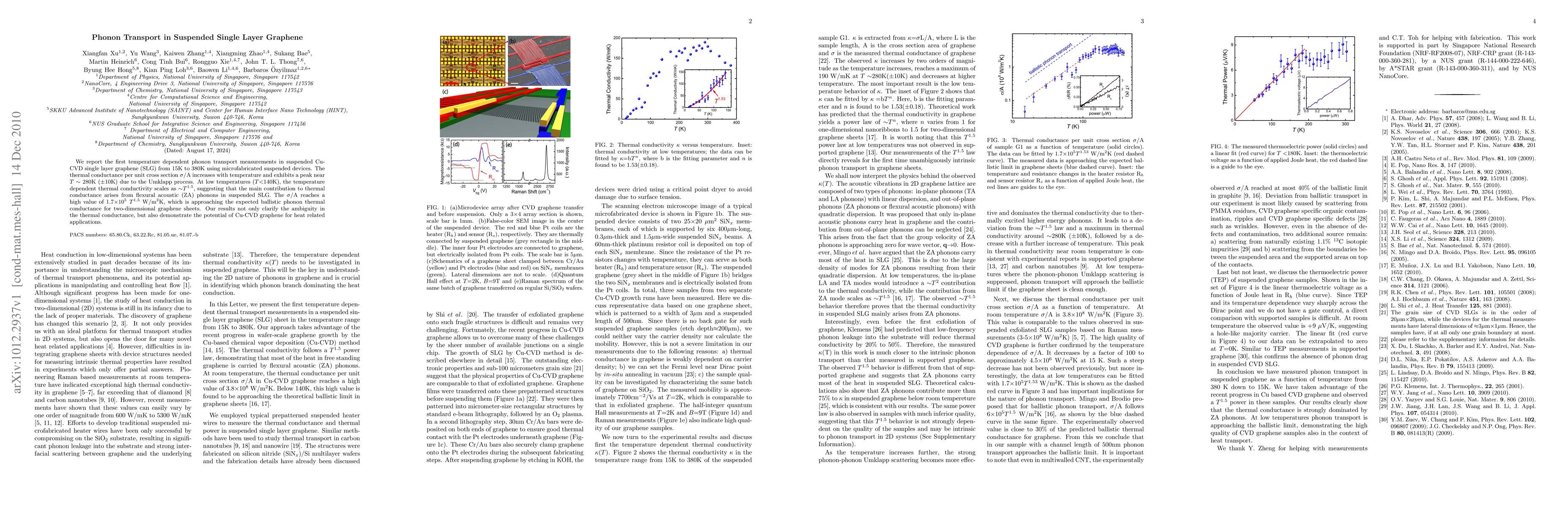 The paper presents the first temperature-dependent phonon transport measurements in suspended single-layer graphene, revealing the dominant role of flexural acoustic phonons in low-temperature heat conduction and approaching ballistic thermal conductance at room temperature.