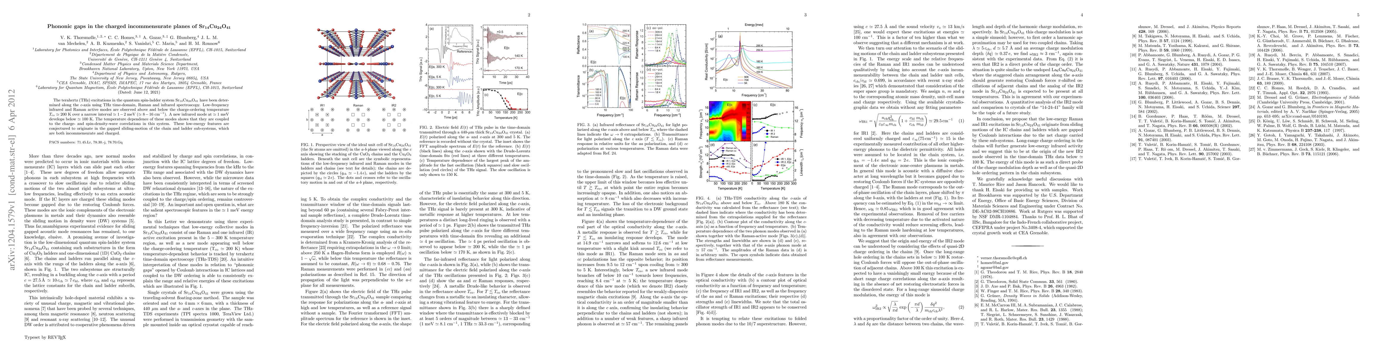 The terahertz (THz) excitations in the quantum spin-ladder system Sr14Cu24O41 have been determined along the c-axis using THz time-domain, Raman and infrared spectroscopy. Low-frequency infrared and Raman active modes are observed above and below the charge-ordering temperature T_{co} ~ 200 K over a narrow interval of 1 - 2 meV . A new infrared mode around 1 meV develops below ~ 100 K. The temperature dependence of these modes shows that they are coupled to the charge- and spin-density-wave correlations in this system. These low-energy features are conjectured to originate in the gapped sliding-motion of the chain and ladder sub-systems, which are both incommensurate and charged.