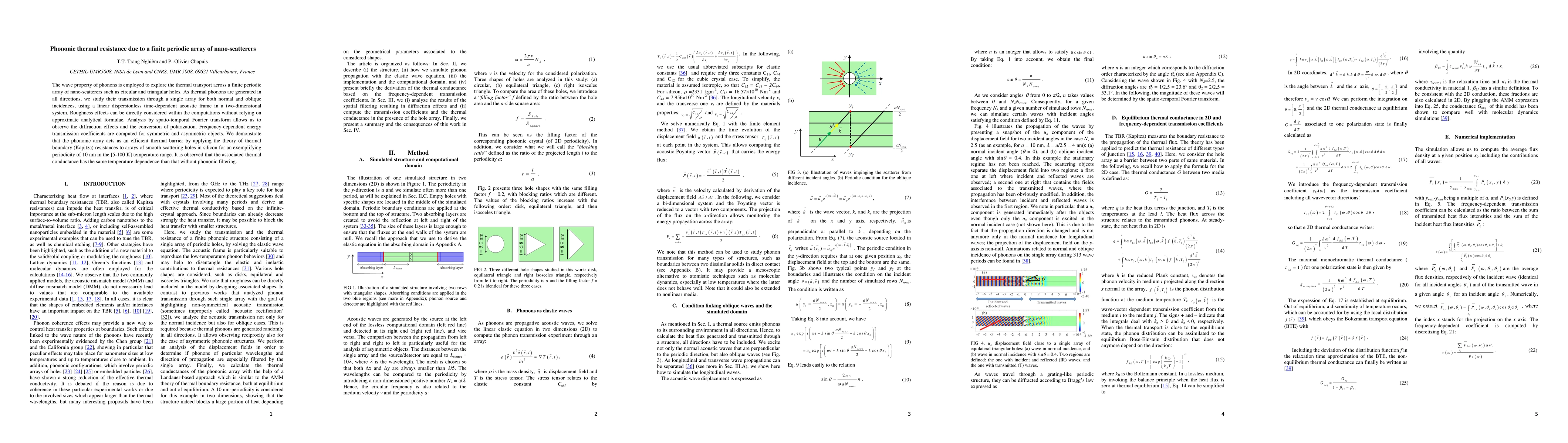 The wave property of phonons is employed to explore the thermal transport across a finite periodic array of nano-scatterers such as circular and triangular holes. As thermal phonons are generated in all directions, we study their transmission through a single array for both normal and oblique incidences, using a linear dispersionless time-dependent acoustic frame in a two-dimensional system. Roughness effects can be directly considered within the computations without relying on approximate analytical formulae. Analysis by spatio-temporal Fourier transform allows us to observe the diffraction effects and the conversion of polarization. Frequency-dependent energy transmission coefficients are computed for symmetric and asymmetric objects. We demonstrate that the phononic array acts as an efficient thermal barrier by applying the theory of thermal boundary (Kapitza) resistances to arrays of smooth scattering holes in silicon for an exemplifying periodicity of 10 nm in the [5-100 K] temperature range. It is observed that the associated thermal conductance has the same temperature dependence than that without phononic filtering.
