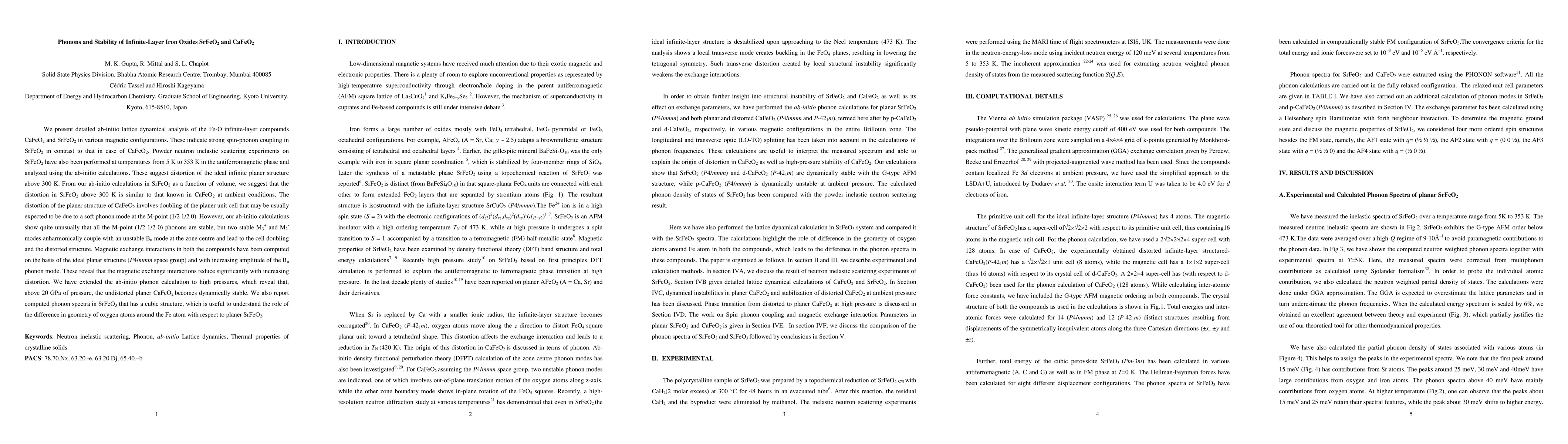 We present detailed ab-initio lattice dynamical analysis of the Fe-O infinite-layer compounds CaFeO2 and SrFeO2 in various magnetic configurations. These indicate strong spin-phonon coupling in SrFeO2 in contrast to that in case of CaFeO2. Powder neutron inelastic scattering experiments on SrFeO2 have also been performed at temperatures from 5 K to 353 K in the antiferromagnetic phase and analyzed using the ab-initio calculations. These suggest distortion of the ideal infinite planer structure above 300 K. From our ab-initio calculations in SrFeO2 as a function of volume, we suggest that the distortion in SrFeO2 above 300 K is similar to that known in CaFeO2 at ambient conditions. The distortion of the planer structure of CaFeO2 involves doubling of the planer unit cell that may be usually expected to be due to a soft phonon mode at the M-point (1/2 1/2 0). However, our ab-initio calculations show quite unusually that all the M-point (1/2 1/2 0) phonons are stable, but two stable M3+ and M2-modes anharmonically couple with an unstable Bu mode at the zone centre and lead to the cell doubling and the distorted structure. Magnetic exchange interactions in both the compounds have been computed on the basis of the ideal planar structure (P4/mmm space group) and with increasing amplitude of the Bu phonon mode. These reveal that the magnetic exchange interactions reduce significantly with increasing distortion. We have extended the ab-initio phonon calculation to high pressures, which reveal that, above 20 GPa of pressure, the undistorted planer CaFeO2 becomes dynamically stable. We also report computed phonon spectra in SrFeO3 that has a cubic structure, which is useful to understand the role of the difference in geometry of oxygen atoms around the Fe atom with respect to planer SrFeO2.