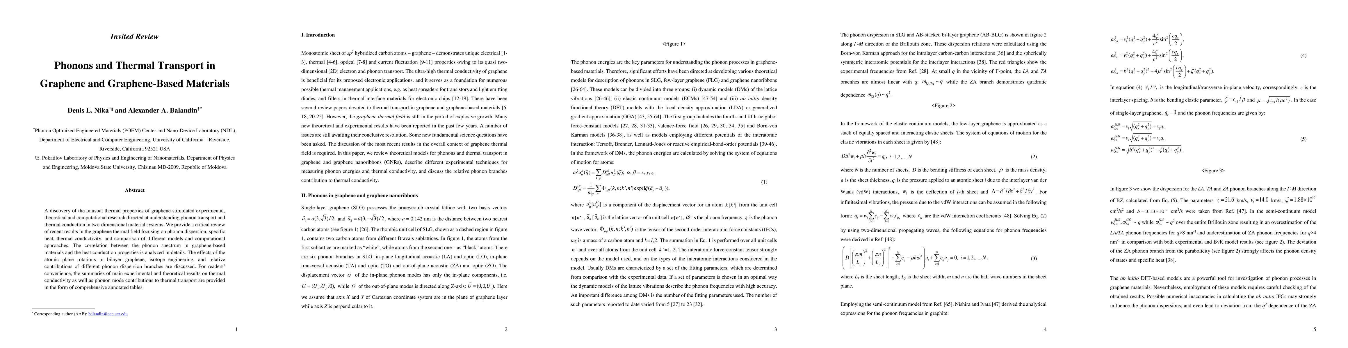 A discovery of the unusual thermal properties of graphene stimulated experimental, theoretical and computational research directed at understanding phonon transport and thermal conduction in two-dimensional material systems. We provide a critical review of recent results in the graphene thermal field focusing on phonon dispersion, specific heat, thermal conductivity, and comparison of different models and computational approaches. The correlation between the phonon spectrum in graphene-based materials and the heat conduction properties is analyzed in details. The effects of the atomic plane rotations in bilayer graphene, isotope engineering, and relative contributions of different phonon dispersion branches are discussed. For readers' convenience, the summaries of main experimental and theoretical results on thermal conductivity as well as phonon mode contributions to thermal transport are provided in the form of comprehensive annotated tables.