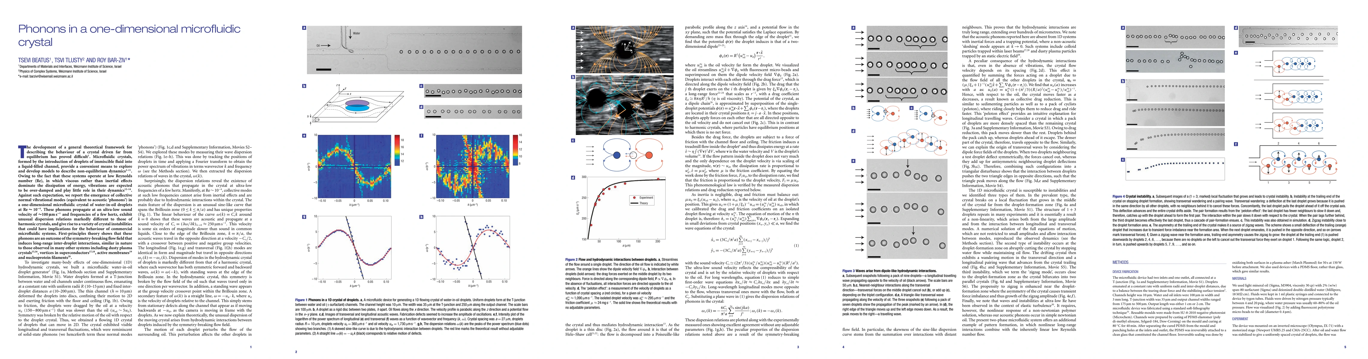 The development of a general theoretical framework for describing the behaviour of a crystal driven far from equilibrium has proved difficult1. Microfluidic crystals, formed by the introduction of droplets of immiscible fluid into a liquid-filled channel, provide a convenient means to explore and develop models to describe non-equilibrium dynamics2, 3, 4, 5, 6, 7, 8, 9, 10, 11. Owing to the fact that these systems operate at low Reynolds number (Re), in which viscous dissipation of energy dominates inertial effects, vibrations are expected to be over-damped and contribute little to their dynamics12, 13, 14. Against such expectations, we report the emergence of collective normal vibrational modes (equivalent to acoustic 'phonons') in a one-dimensional microfluidic crystal of water-in-oil droplets at Reapprox10-4. These phonons propagate at an ultra-low sound velocity of approx100 mum s-1 and frequencies of a few hertz, exhibit unusual dispersion relations markedly different to those of harmonic crystals, and give rise to a variety of crystal instabilities that could have implications for the design of commercial microfluidic systems. First-principles theory shows that these phonons are an outcome of the symmetry-breaking flow field that induces long-range inter-droplet interactions, similar in nature to those observed in many other systems including dusty plasma crystals15, 16, vortices in superconductors17, 18, active membranes19 and nucleoprotein filaments20.