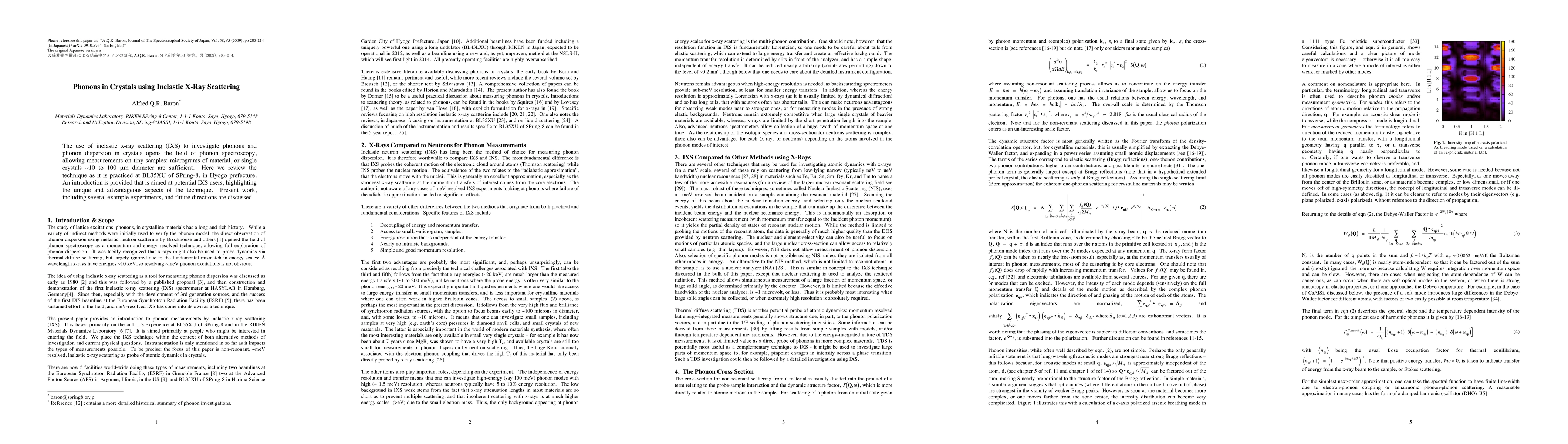 This paper reviews the use of inelastic x-ray scattering (IXS) to investigate phonons and phonon dispersion in crystals, emphasizing its application at BL35XU of SPring-8. It highlights the technique's advantages for studying tiny samples and discusses current experiments and future directions.