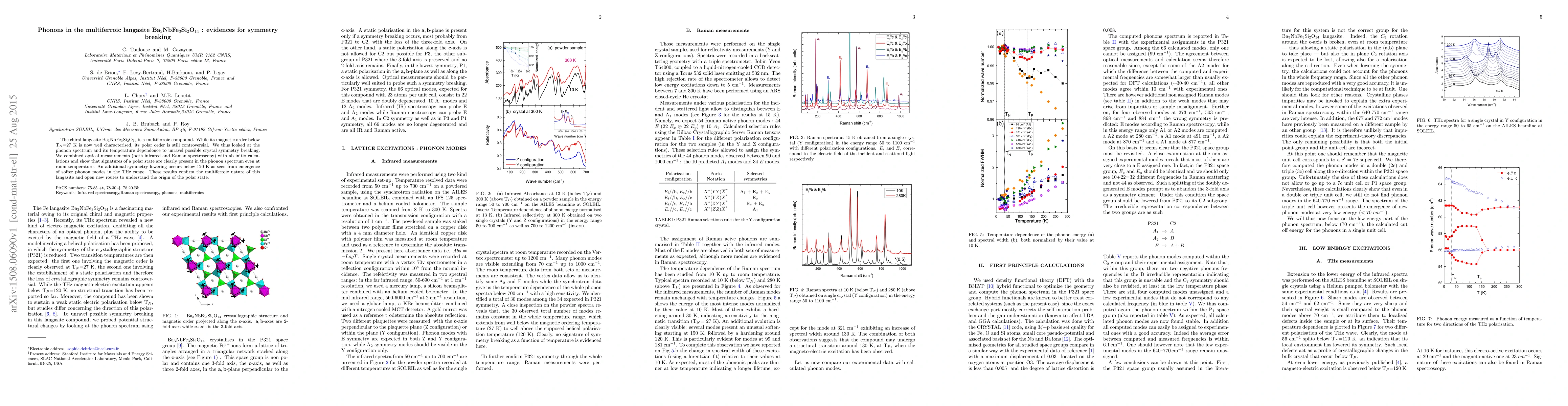 The chiral langasite Ba$\_3$NbFe$\_3$Si$\_2$O$\_{14}$ is a multiferroic compound. While its magnetic order below T$\_N$=27 K is now well characterised, its polar order is still controversial. We thus looked at the phonon spectrum and its temperature dependence to unravel possible crystal symmetry breaking. We combined optical measurements (both infrared and Raman spectroscopy) with ab initio calculations and show that signatures of a polar state are clearly present in the phonon spectrum even at room temperature. An additional symmetry lowering occurs below 120~K as seen from emergence of softer phonon modes in the THz range. These results confirm the multiferroic nature of this langasite and open new routes to understand the origin of the polar state.