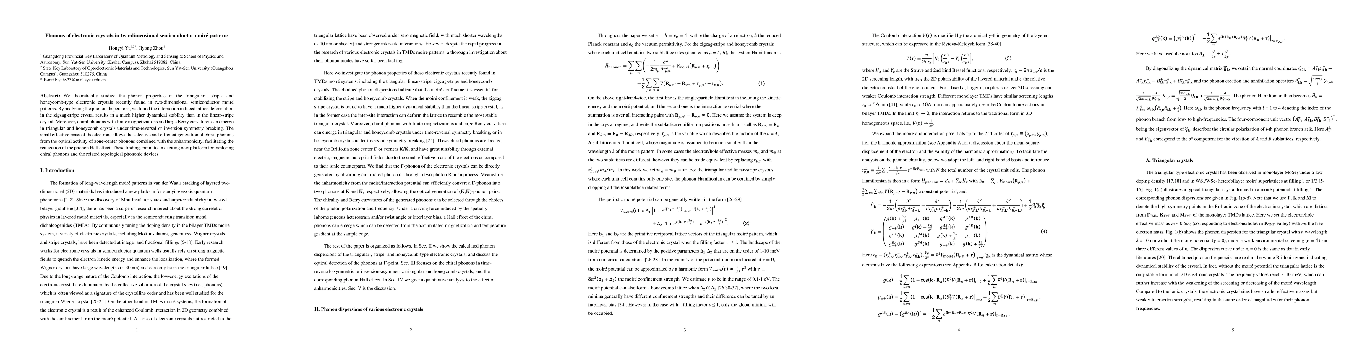 This paper investigates the phonon properties in two-dimensional semiconductor moiré patterns, revealing higher dynamical stability in zigzag-stripe crystals due to lattice deformation. It also identifies chiral phonons in triangular and honeycomb crystals under symmetry breaking, suggesting potential for phonon Hall effect and topological phononic devices.