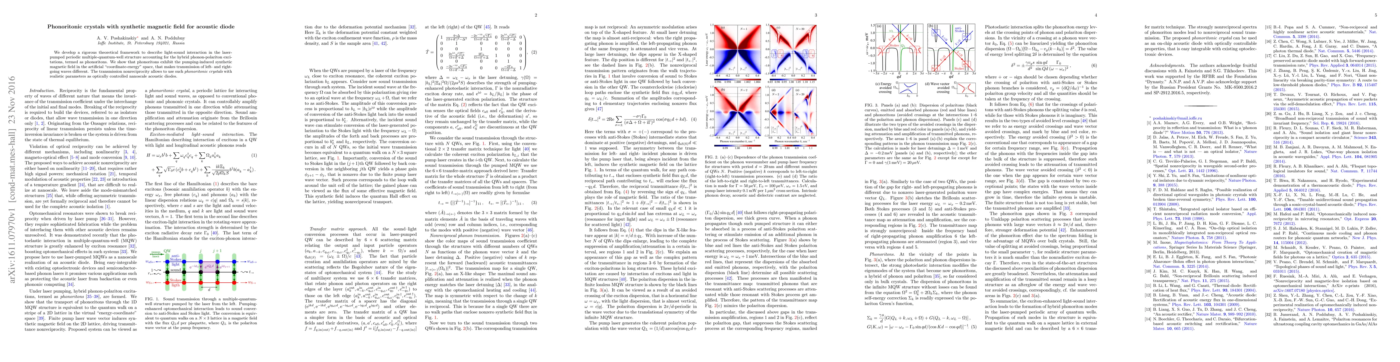 This paper presents a theoretical framework for light-sound interaction in laser-pumped phonon-polariton structures, demonstrating that phonoritons generate a synthetic magnetic field, enabling the creation of an acoustic diode that controls the transmission of left- and right-going waves.