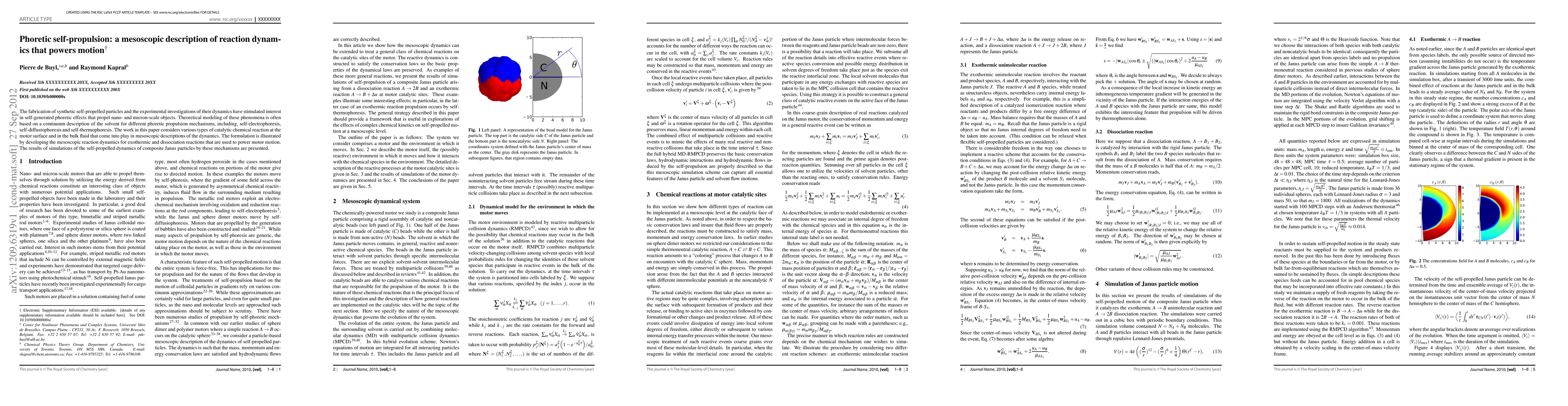 The fabrication of synthetic self-propelled particles and the experimental investigations of their dynamics have stimulated interest in self-generated phoretic effects that propel nano- and micron-scale objects. Theoretical modeling of these phenomena is often based on a continuum description of the solvent for different phoretic propulsion mechanisms, including, self-electrophoresis, self-diffusiophoresis and self-thermophoresis. The work in this paper considers various types of catalytic chemical reaction at the motor surface and in the bulk fluid that come into play in mesoscopic descriptions of the dynamics. The formulation is illustrated by developing the mesoscopic reaction dynamics for exothermic and dissociation reactions that are used to power motor motion. The results of simulations of the self-propelled dynamics of composite Janus particles by these mechanisms are presented.