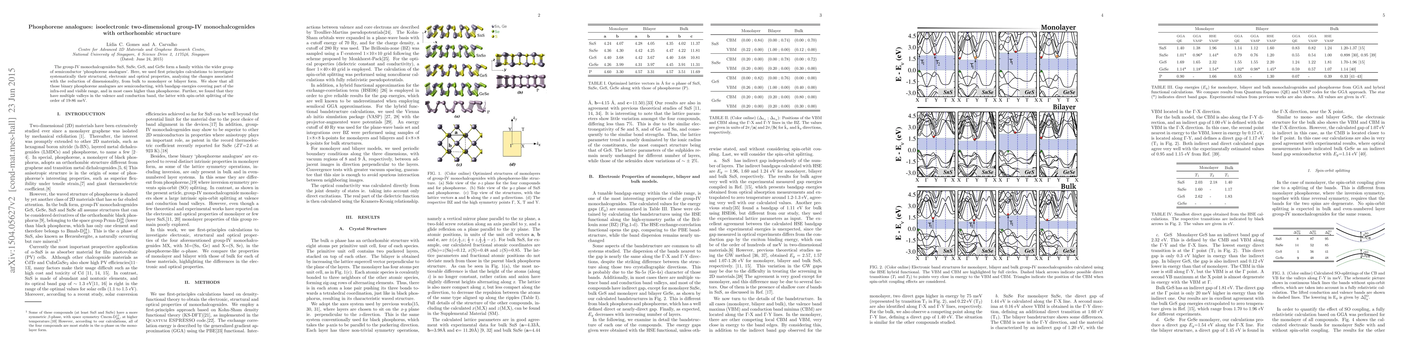This study investigates the structural, electronic, and optical properties of SnS, GeS, SnSe, and GeSe using first principles calculations. The research reveals these materials are semiconducting with bandgaps spanning the infra-red and visible spectrum, often exceeding those of phosphorene, and exhibit multiple valleys and significant spin-orbit coupling.