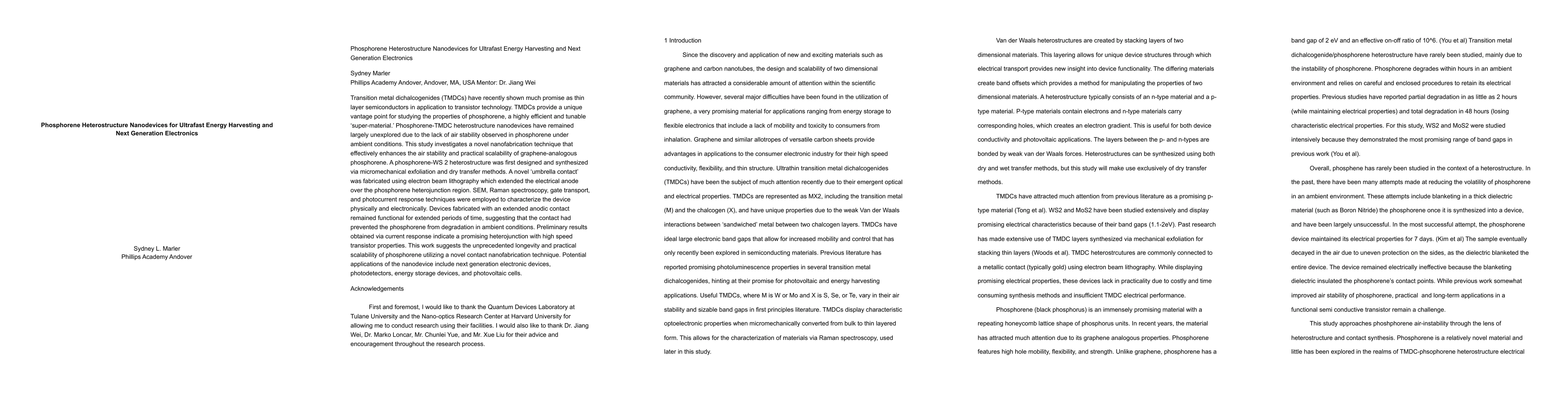 Transition metal dichalcogenides (TMDCs) have recently shown much promise as thin layer semiconductors in application to transistor technology. TMDCs provide a unique vantage point for studying the properties of phosphorene, a highly efficient and tunable super-material. Phosphorene-TMDC heterostructure nanodevices have remained largely unexplored due to the lack of air stability observed in phosphorene under ambient conditions. This study investigates a novel nanofabrication technique that effectively enhances the air stability and practical scalability of graphene-analogous phosphorene. A phosphorene-WS2 heterostructure was first designed and synthesized via micromechanical exfoliation and dry transfer methods. A novel umbrella contact was fabricated using electron beam lithography which extended the electrical anode over the phosphorene heterojunction region. SEM, Raman spectroscopy, gate transport, and photocurrent response techniques were employed to characterize the device physically and electronically. Devices fabricated with an extended anodic contact remained functional for extended periods of time, suggesting that the contact had prevented the phosphorene from degradation in ambient conditions. Preliminary results obtained via current response indicate a promising heterojunction with high speed transistor properties. This work suggests the unprecedented longevity and practical scalability of phosphorene utilizing a novel contact nanofabrication technique. Potential applications of the nanodevice include next generation electronic devices, photodetectors, energy storage devices, and photovoltaic cells.