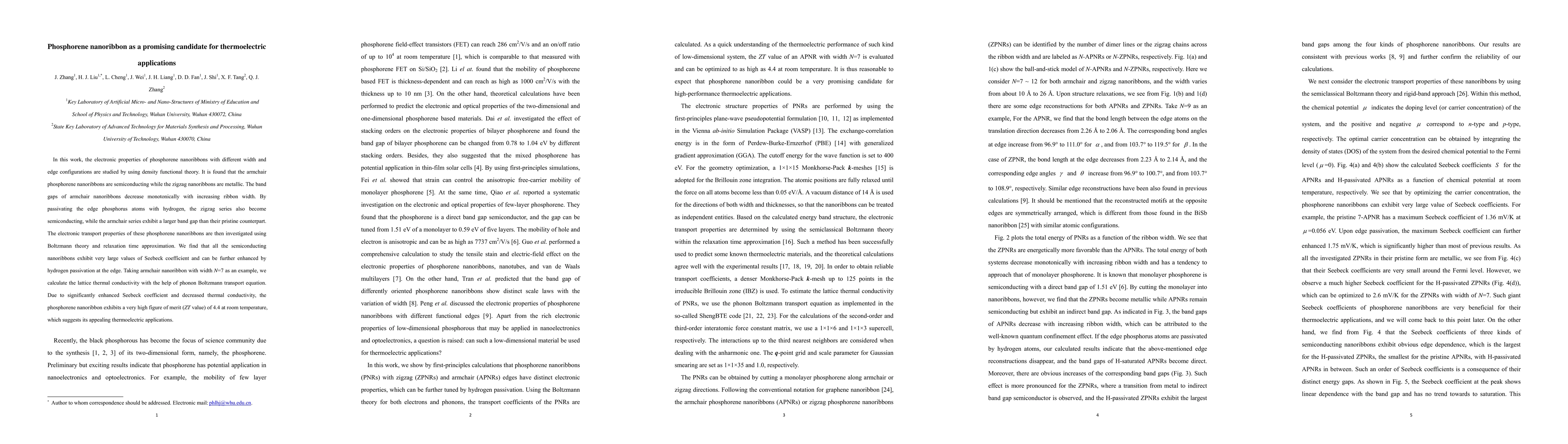 This study reveals that phosphorene nanoribbons, particularly armchair types, exhibit semiconducting properties with tunable band gaps, while zigzag nanoribbons can be made semiconducting via hydrogen passivation. The high Seebeck coefficient and low thermal conductivity of these nanoribbons result in a promising thermoelectric figure of merit (ZT) of 4.0 at room temperature.