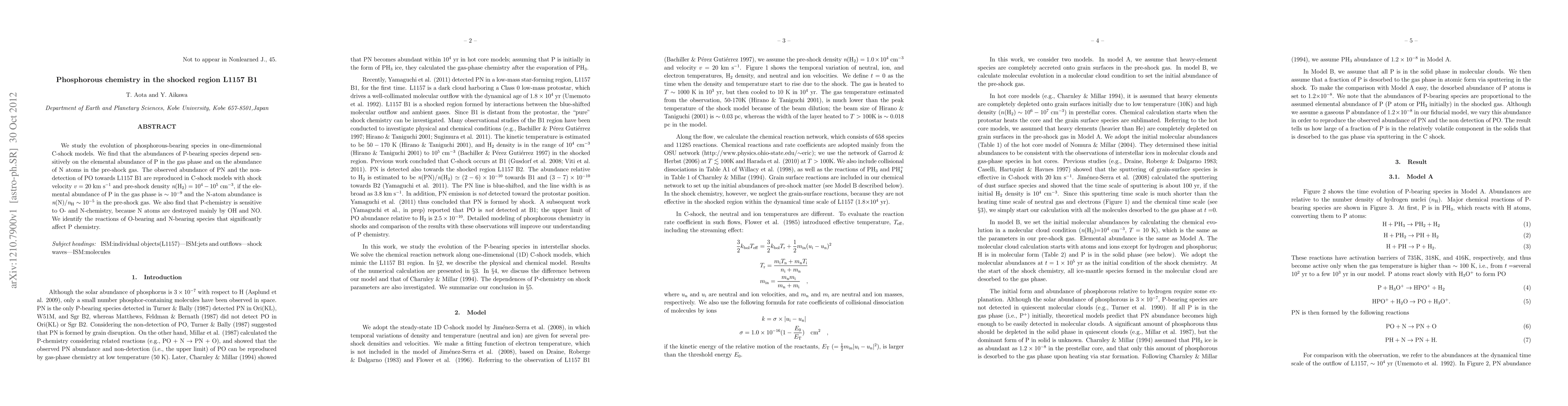 We study the evolution of phosphorous-bearing species in one-dimensional C-shock models. We find that the abundances of P-bearing species depend sensitively on the elemental abundance of P in the gas phase and on the abundance of N atoms in the pre-shock gas. The observed abundance of PN and the non-detection of PO towards L1157 B1 are reproduced in C-shock models with shock velocity v=20km s-1 and pre-shock density n(H2) =10^4 - 10^5, if the elemental abundance of P in the gas phase is 10^-9 and the N-atom abundance is n(N)/nH - 10^-5 in the pre-shock gas. We also find that P-chemistry is sensitive to O- and N-chemistry, because N atoms are destroyed mainly by OH and NO. We identify the reactions of O-bearing and N-bearing species that significantly affect P chemistry.