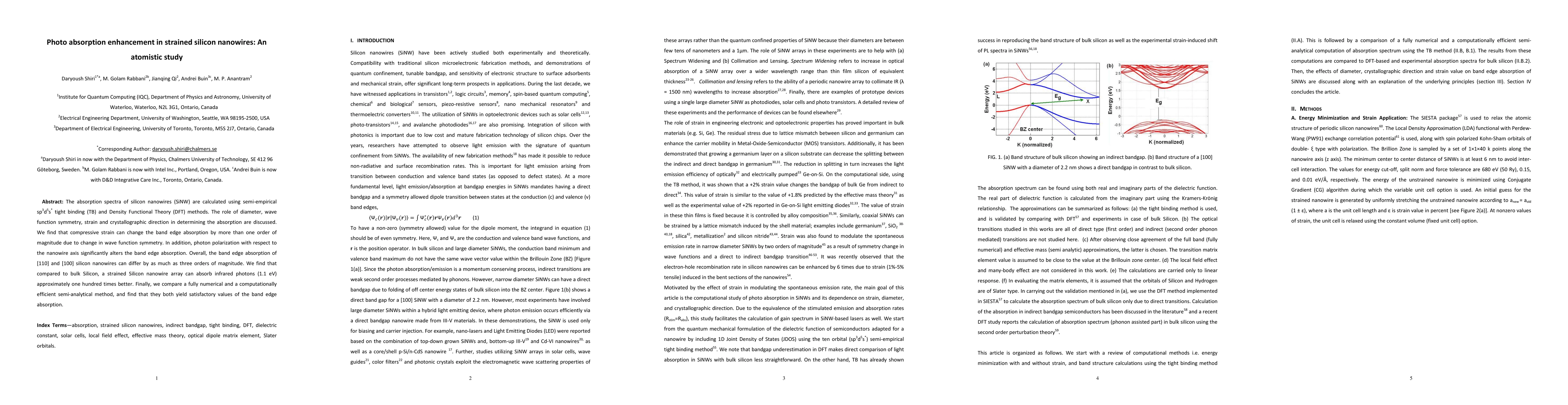The absorption spectra of silicon nanowires (SiNW) are calculated using semi-empirical $sp^{3}d^{5}s^{*}$ tight binding (TB) and Density Functional Theory (DFT) methods. The role of diameter, wave function symmetry, strain and crystallographic direction in determining the absorption are discussed. We find that compressive strain can change the band edge absorption by more than one order of magnitude due to change in wave function symmetry. In addition, photon polarization with respect to the nanowire axis significantly alters the band edge absorption. Overall, the band edge absorption of [110] and [100] silicon nanowires can differ by as much as three orders of magnitude. We find that compared to bulk Silicon, a strained Silicon nanowire array can absorb infrared photons (1.1 eV) approximately one hundred times better. Finally, we compare a fully numerical and a computationally efficient semi-analytical method, and find that they both yield satisfactory values of the band edge absorption.