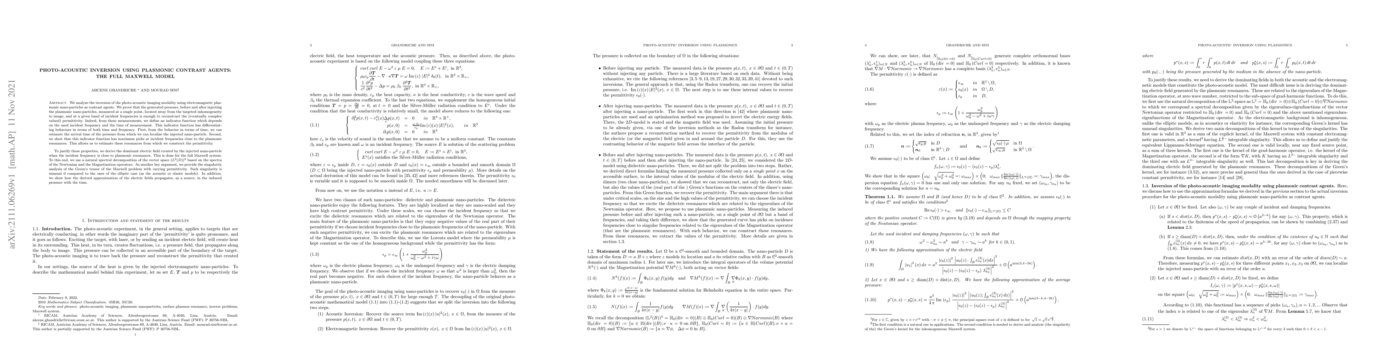 We analyze the inversion of the photo-acoustic imaging modality using electromagnetic plasmonic nano-particles as contrast agents. We prove that the generated pressure, before and after injecting the plasmonic nano-particles, measured at a single point, located away from the targeted inhomogeneity to image, and at a given band of incident frequencies is enough to reconstruct the (eventually complex valued) permittivity. Indeed, from these measurements, we define an indicator function which depends on the used incident frequency and the time of measurement. This indicator function has differentiating behaviors in terms of both time and frequency. First, from the behavior in terms of time, we can estimate the arrival time of the pressure from which we can localize the injected nano-particle. Second, we show that this indicator function has maximum picks at incident frequencies close to the plasmonic resonances. This allows us to estimate these resonances from which we construct the permittivity. To justify these properties, we derive the dominant electric field created by the injected nano-particle when the incident frequency is close to plasmonic resonances. This is done for the full Maxwell system. To this end, we use a natural spectral decomposition of the vector space (L^2(D))^3 based on the spectra of the Newtonian and the Magnetization operators. As another key argument, we provide the singularity analysis of the Green's tensor of the Maxwell problem with varying permittivity. Such singularity is unusual if compared to the ones of the elliptic case (as the acoustic or elastic models). In addition, we show how the derived approximation of the electric fields propagates, as a source, in the induced pressure with the time.