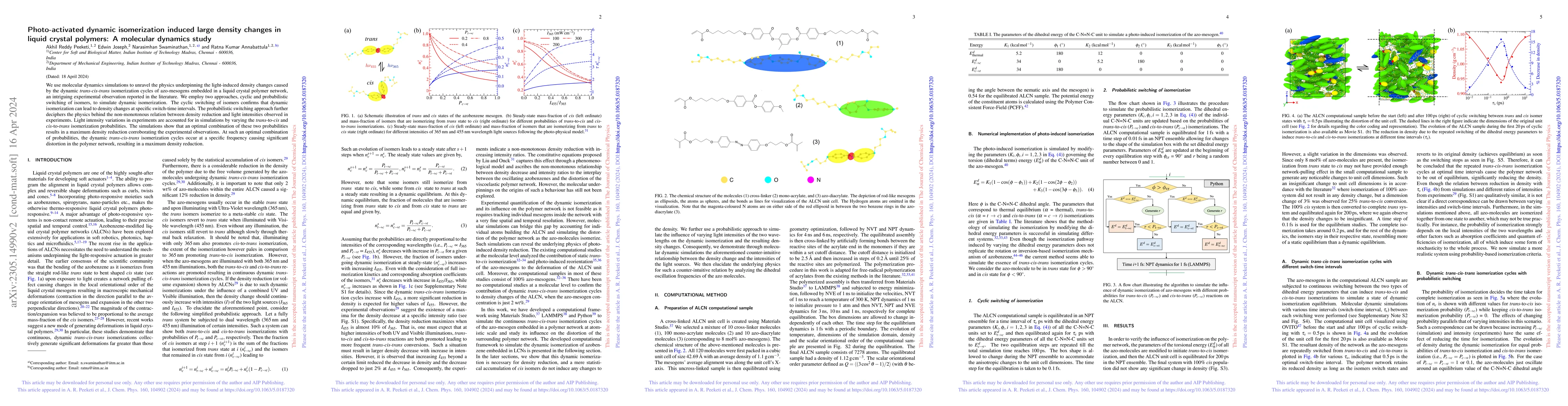 This study uses molecular dynamics simulations to explore how light-induced trans-cis-trans isomerization in azo-mesogens within liquid crystal polymers leads to significant density changes. The simulations reveal that cyclic and probabilistic switching of isomers can reproduce experimental observations, highlighting an optimal probability combination for maximum density reduction due to polymer network distortion.