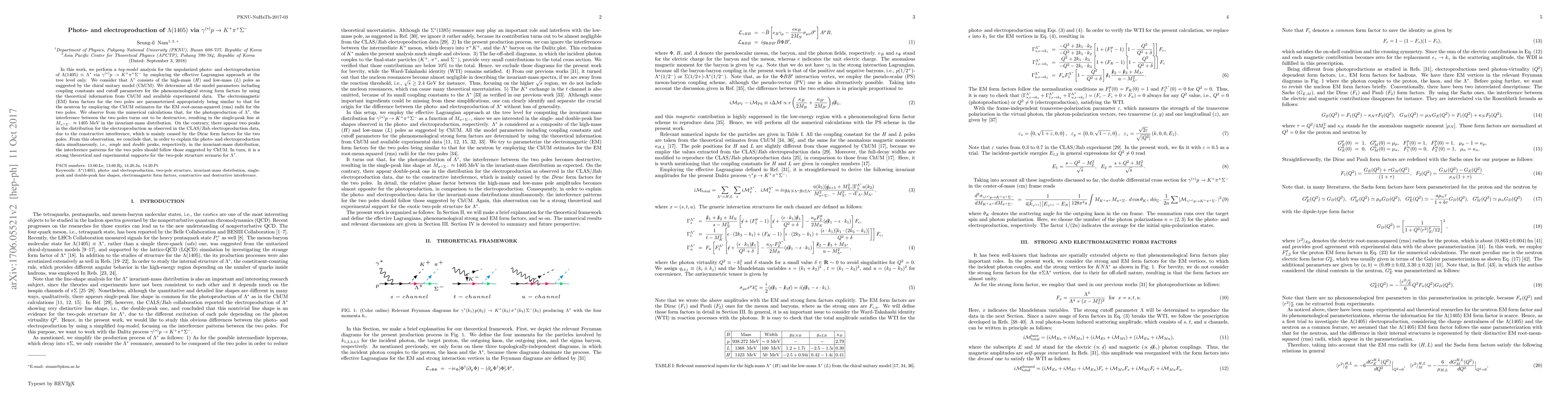 This study uses a simplified model to analyze gamma and e production of Lambda(1405), finding a single peak for gamma and two peaks for e, supporting the two-pole structure of Lambda(1405) suggested by the chiral unitary model.
