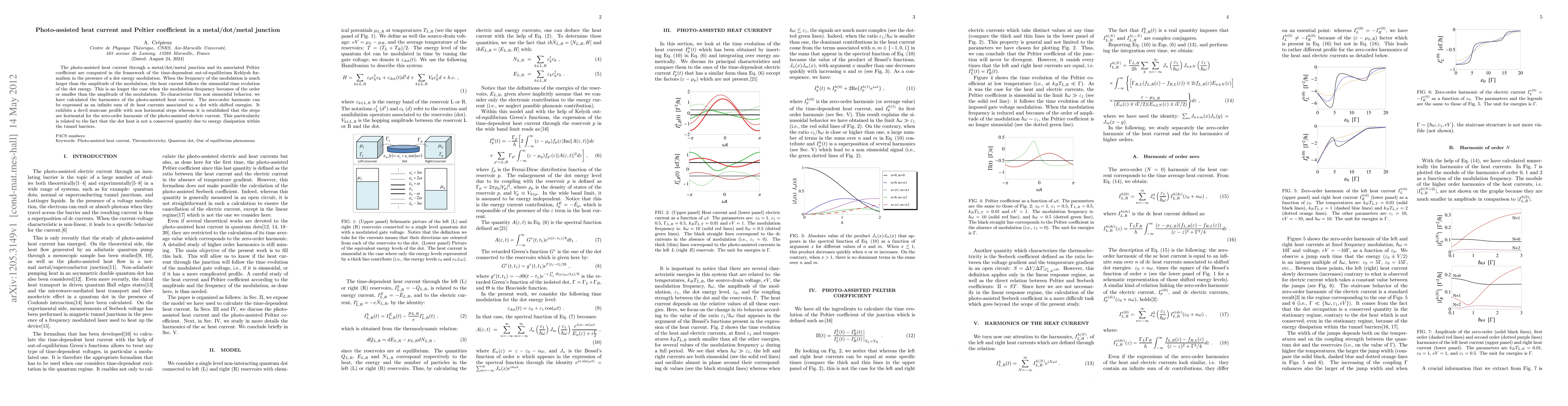 The photo-assisted heat current through a metal/dot/metal junction and its associated Peltier coefficient are computed in the framework of the time-dependent out-of-equilibrium Keldysh formalism in the presence of a dot energy modulation. When the frequency of the modulation is much larger than the amplitude of the modulation, the heat current follows the sinusoidal time evolution of the dot energy. This is no longer the case when the modulation frequency becomes of the order or smaller than the amplitude of the modulation. To characterize this non sinusoidal behavior, we have calculated the harmonics of the photo-assisted heat current. The zero-order harmonic can be expressed as an infinite sum of dc heat currents associated to a dot with shifted energies. It exhibits a devil staircase profile with non horizontal steps whereas it is established that the steps are horizontal for the zero-order harmonic of the photo-assisted electric current. This particularity is related to the fact that the dot heat is not a conserved quantity due to energy dissipation within the tunnel barriers.